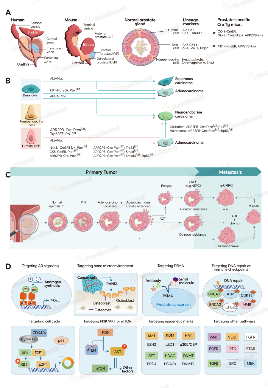 The prostate gland comprises three distinct terminally differentiated epithelial cell types (Figure 1A): luminal cells, basal cells, and neuroendocrine cells. Luminal cells highly express CK8, CK18, and AR; basal cells predominantly express CK5 and p63; neuroendocrine cells are characterized by high Synaptophysin expression. In spontaneous prostate cancer mouse models, APRR2PB-Cre is commonly employed for conditional knockout of tumour suppressor genes, such as Pten and Trp53, in basal and luminal cells, inducing primary prostate cancer from these cell populations (Figure 1B). Research demonstrates that under androgen deprivation stress, epigenetic dysregulation, transcription factor networks, and metabolic adaptations collectively drive adenocarcinoma cells to transform toward a neuroendocrine cancer phenotype. However, whether neuroendocrine cells can directly transform into cancer remains unknown.