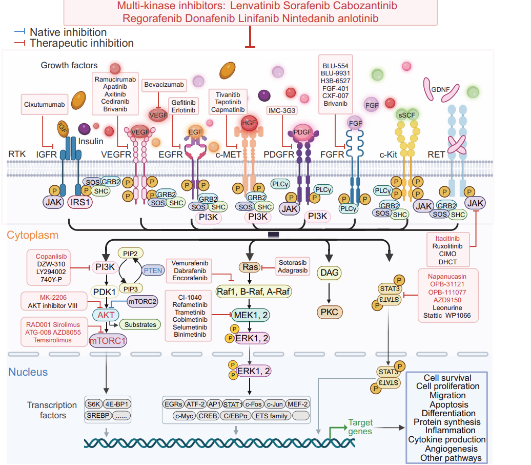 RTK pathways constitute the central drivers of HCC proliferation, angiogenesis, and therapeutic resistance. Among these, VEGFR, FGFR4, c-Met, and EGFR represent clinically validated therapeutic targets. Multi-targeted tyrosine kinase inhibitors (TKIs) such as Sorafenib and Lenvatinib, as well as immuno-angiogenesis combination regimens (e.g., Atezolizumab plus Bevacizumab), have become standard-of-care treatments for HCC. Nevertheless, resistance mechanisms and toxicity profiles remain significant clinical challenges.