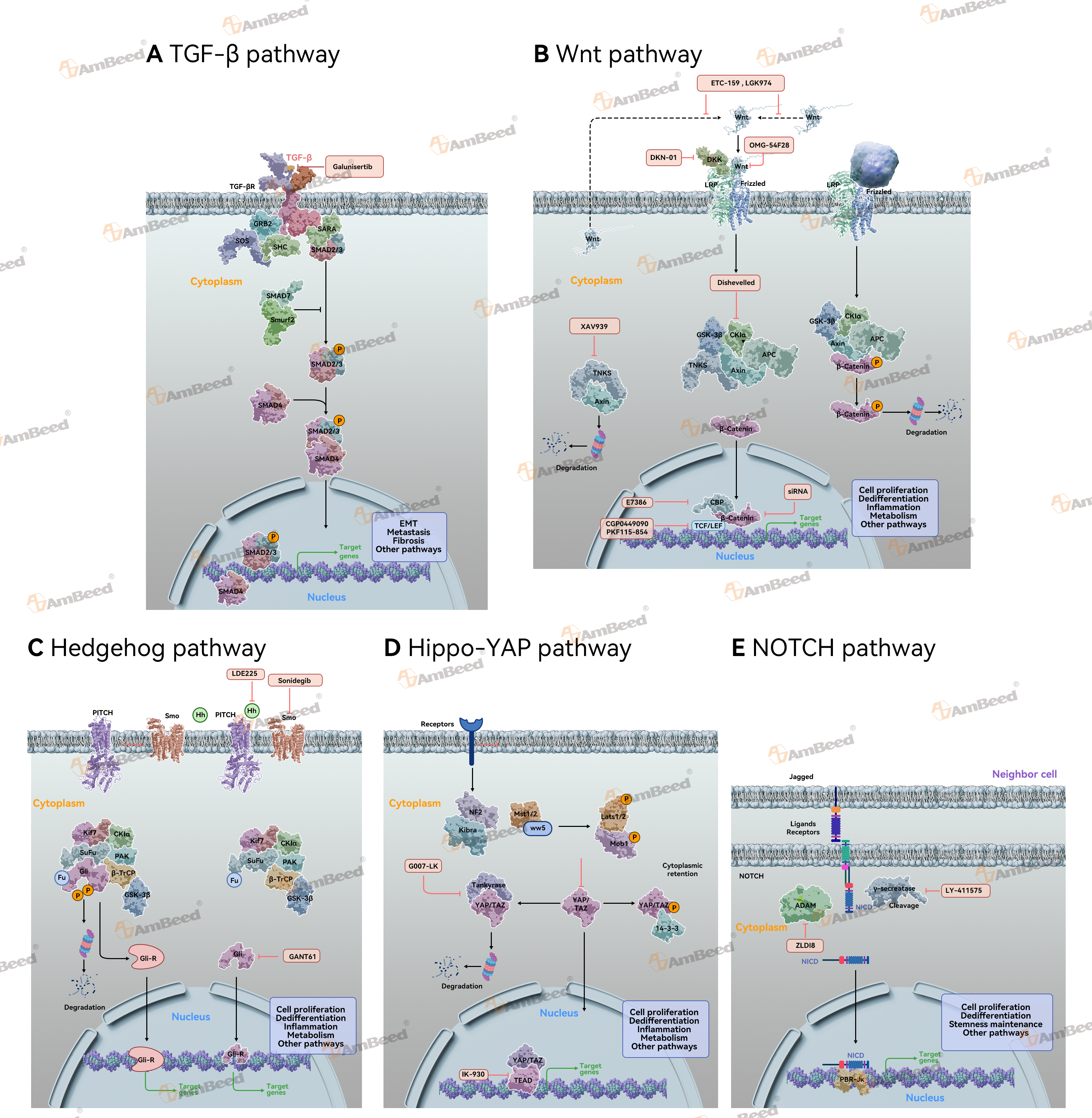 1. Function: The TGF-β pathway operates through ligand binding (TGF-β1/2/3) to membrane receptors (TGF-βRI/II), activating downstream SMAD proteins (SMAD2/3/4) that form complexes translocating to the nucleus to regulate target gene expression. This pathway participates in cellular proliferation, differentiation, fibrosis, and immunomodulation [14].