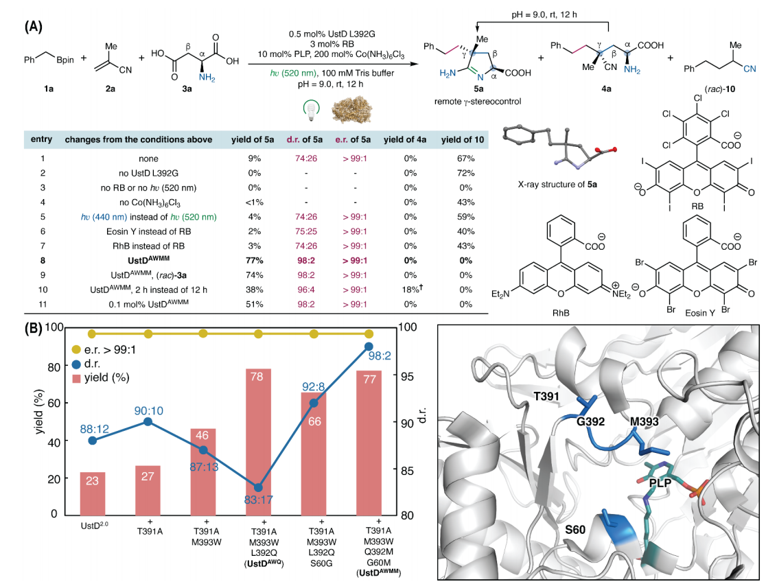 At the outset of this study, the research team employed the PLP-dependent decarboxylase mutant UstD-L392G, pairing it with the photosensitizer Rose Bengal and irradiating the reaction with green light (520 nm) to initiate radical generation and transfer. Under these conditions, the cyclized product 5a featuring a skipped α,γ-stereochemical dyad and a γ-quaternary stereocenter was obtained in low yield (9 %) yet with high stereoselectivity (d.r. = 74 : 26, e.r. > 99 : 1) (Figure 2A). Subsequently, the team conducted four rounds of directed evolution, introducing mutations within the active site and nearby flexible loop regions to progressively improve both catalytic efficiency and stereocontrol. The final variant, UstDᴬᵂᴹᴹ, which carries four mutations (T391A, M393W, L392M, and S60M), elevated the yield of 5a to 77 % while maintaining an exceptionally high stereoselectivity of 98 : 2 (Figure 2B).