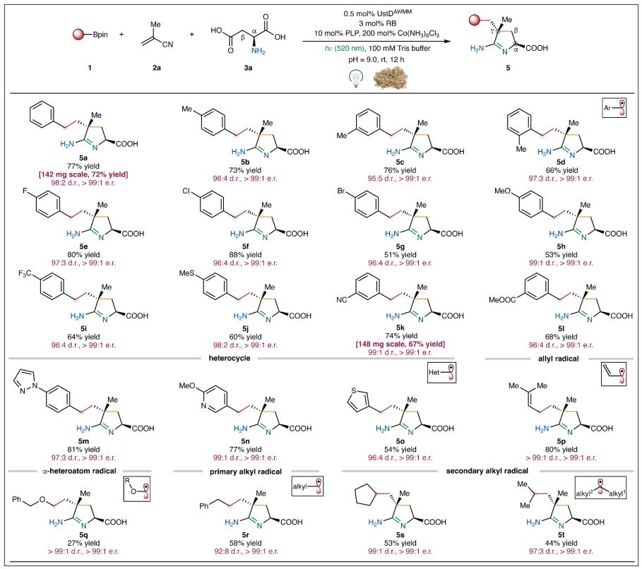 Figure 2. Diastereo- and enantioselective photobiocatalytic three-component radical coupling of organoboronates, methacrylonitrile and aspartic acid