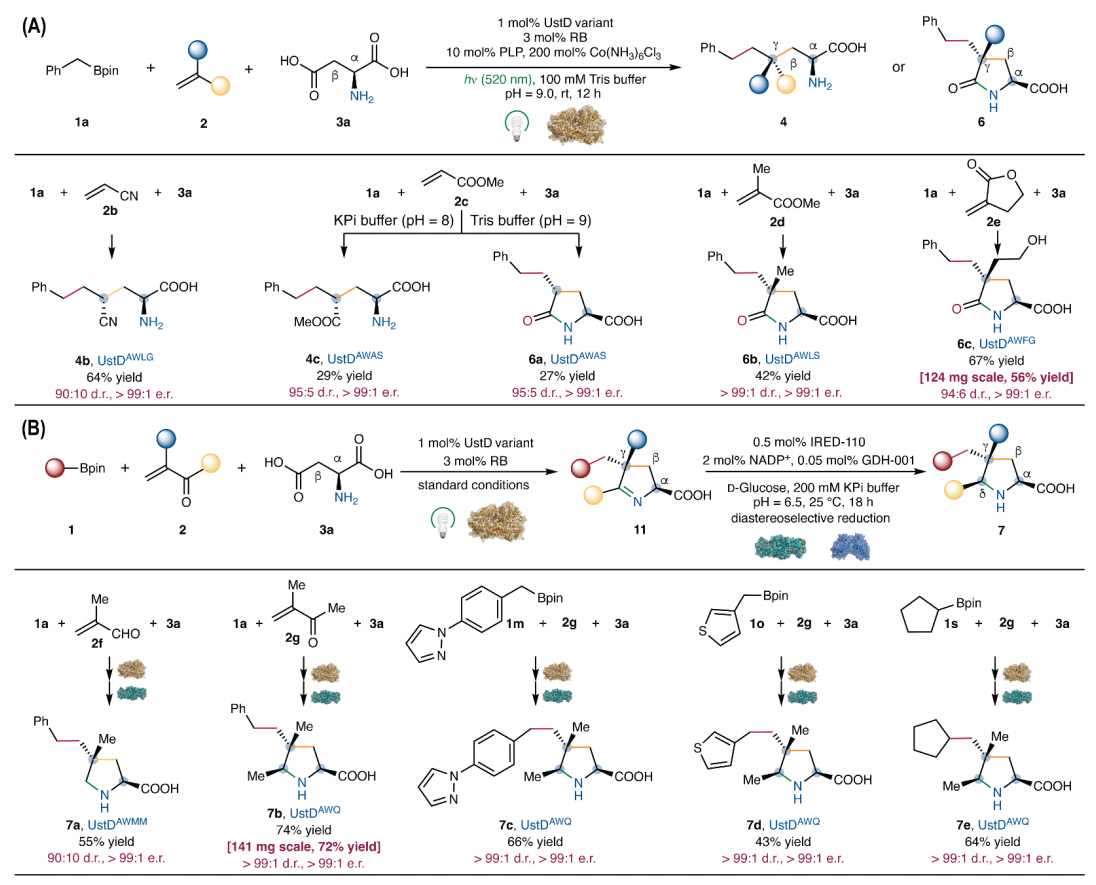 Beyond methacrylonitrile, the researchers surveyed a range of additional α,β-unsaturated compounds as radical acceptors in the three-component radical coupling (Figure 4A). Substrates included acrylonitrile, methyl acrylate, and α-substituted acrylates such as methyl methacrylate and α-methylene-γ-lactone, delivering products ranging from non-cyclized amino esters (4b, 4c) to cyclic, non-natural γ-lactams (6a–6c). α,β-unsaturated aldehydes and ketones were also excellent radical acceptors, furnishing δ-oxo-α-amino acids that spontaneously underwent intramolecular amine–carbonyl condensation to form the corresponding cyclic imines 11 (Figure 4B). These imines were readily reduced by an imine reductase (IRED-110) to furnish structurally novel, polysubstituted, non-natural proline derivatives (7a, 7b) with outstanding diastereo- and enantiocontrol. Overall, the broad scope of radical acceptors and the excellent structural diversity of the resulting products demonstrated the potential of this photobiocatalytic three-component radical coupling in diversity-oriented synthesis.