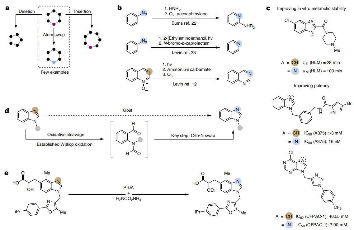 Molecular skeleton editing has emerged as a frontier in contemporary organic chemistry, and single-atom swap reactions are attracting particular attention because they allow the core of a molecule to be altered with surgical precision. The ability to selectively edit organic molecules at the atomic level has the potential to streamline lead discovery and optimization in the pharmaceutical and agrochemical industry. While numerous atom insertion and deletion reactions have recently been reported, examples of single atom swaps remain scarce due to the challenge of orchestrating the selective cleavage and formation of multiple chemical bonds around the same atom. As of 2024, indole is still the sixth most prevalent nitrogen heterocycle in FDA-approved drugs, yet it is regarded as a problematic scaffold in modern drug discovery: its metabolic hot-spots (that is, 2- and 3-position) are readily oxidized to highly reactive metabolites, leading to undesirable absorption-distribution-metabolism-excretion and/or toxicity profiles. Changing from a more electron-rich heterocycle, such as an indole, to a less electron-rich one, such as a benzimidazole, often has a positive effect on pharmacokinetics (Fig. 1c, top) by removing metabolic hot spots and decreasing phase I (cytochrome P450 enzyme) oxidations, ultimately improving the success rate in lead optimization campaigns.