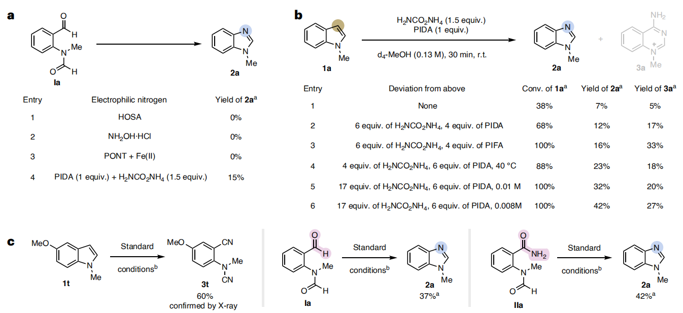 First, the authors chose the Witkop oxidation product Ia—readily accessible from the oxidative cleavage of the corresponding methyl indole 1a—as a model substrate to probe possible rearrangements (Fig. 2a). An initial screen revealed that the PIDA / H₂NCO₂NH₄ pair delivered the desired benzimidazole in 7 % ¹H-NMR yield. Further optimization showed that performing the reaction at lower concentration with 17 equiv of H₂NCO₂NH₄ and 6 equiv of PIDA furnishes 2a in 42 % ¹H-NMR yield in a one-pot reaction (Fig. 2b).