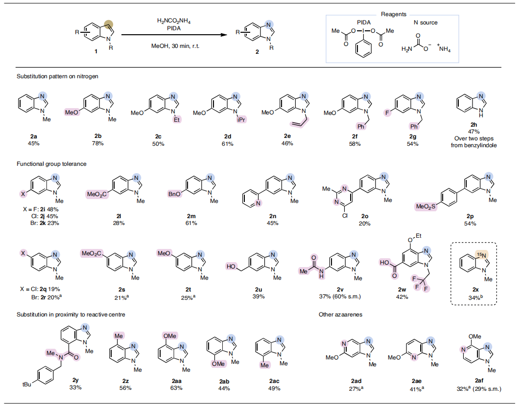 Recently, the group of Bill Morandi at ETH Zürich has unveiled a novel “C-to-N swap” strategy for N-alkyl indoles: at room temperature in methanol, using commercially available PIDA (phenyliodine(III) diacetate) as oxidant and H₂NCO₂NH₄ as nitrogen source, the protocol converts indoles into the corresponding benzimidazoles in a one-pot process within only 30 minutes. The reaction leverages the innate reactivity of the indole scaffold to engage in an initial oxidative cleavage step, followed by oxidative amidation, Hofmann-type rearrangement and cyclization. The reaction tolerates a wide range of functional groups, which is demonstrated by the interconversion of 15 drug-like molecules. The work is reported in Nat. Chem.