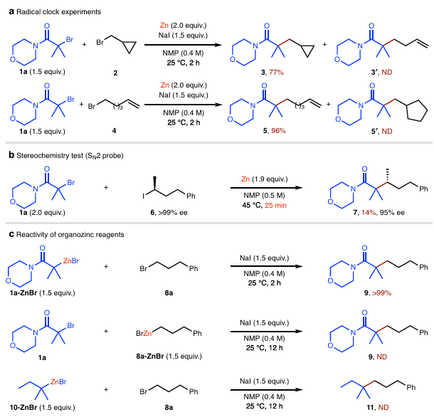 The use of ultra-high-purity zinc powder (99.999%) yielded nearly identical results compared to unpurified zinc powder, effectively ruling out trace transition metal catalysis. Furthermore, complete reaction inhibition was observed when manganese (Mn) was substituted for zinc, confirming zinc's essential role. Radical clock experiments using (bromomethyl)cyclopropane and 6-bromohex-1-ene showed no detection of radical-derived ring-opening or cyclization byproducts. Stereochemical integrity was maintained when optically pure secondary alkyl iodide was employed: only minimal erosion of enantiomeric purity occurred, which was definitively attributed to substrate racemization mediated by iodide anions rather than the coupling process itself. These results collectively demonstrate that the carbon-carbon bond formation proceeds without involving radical intermediates or a single-electron transfer (SET) pathway.