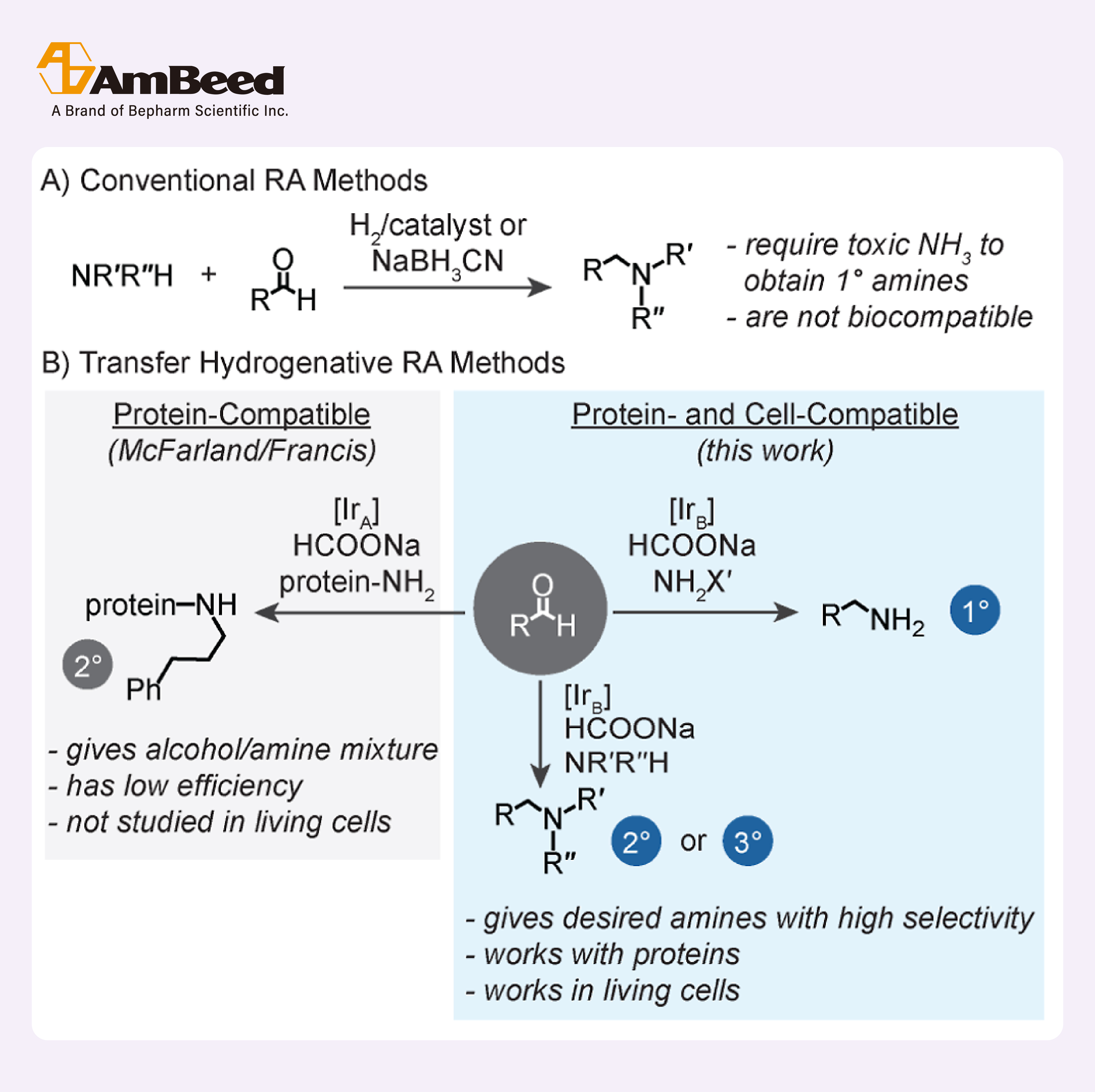·Challenges of traditional methods: Traditional RA methods have multiple problems, such as over-alkylation, competition for aldehyde reduction to alcohols, toxicity of nitrogen donors, and instability of metal catalysts in biological media. These methods usually require heterogeneous catalysts that are impermeable to cells or potentially toxic hydride sources, and are therefore not applicable to living cells.