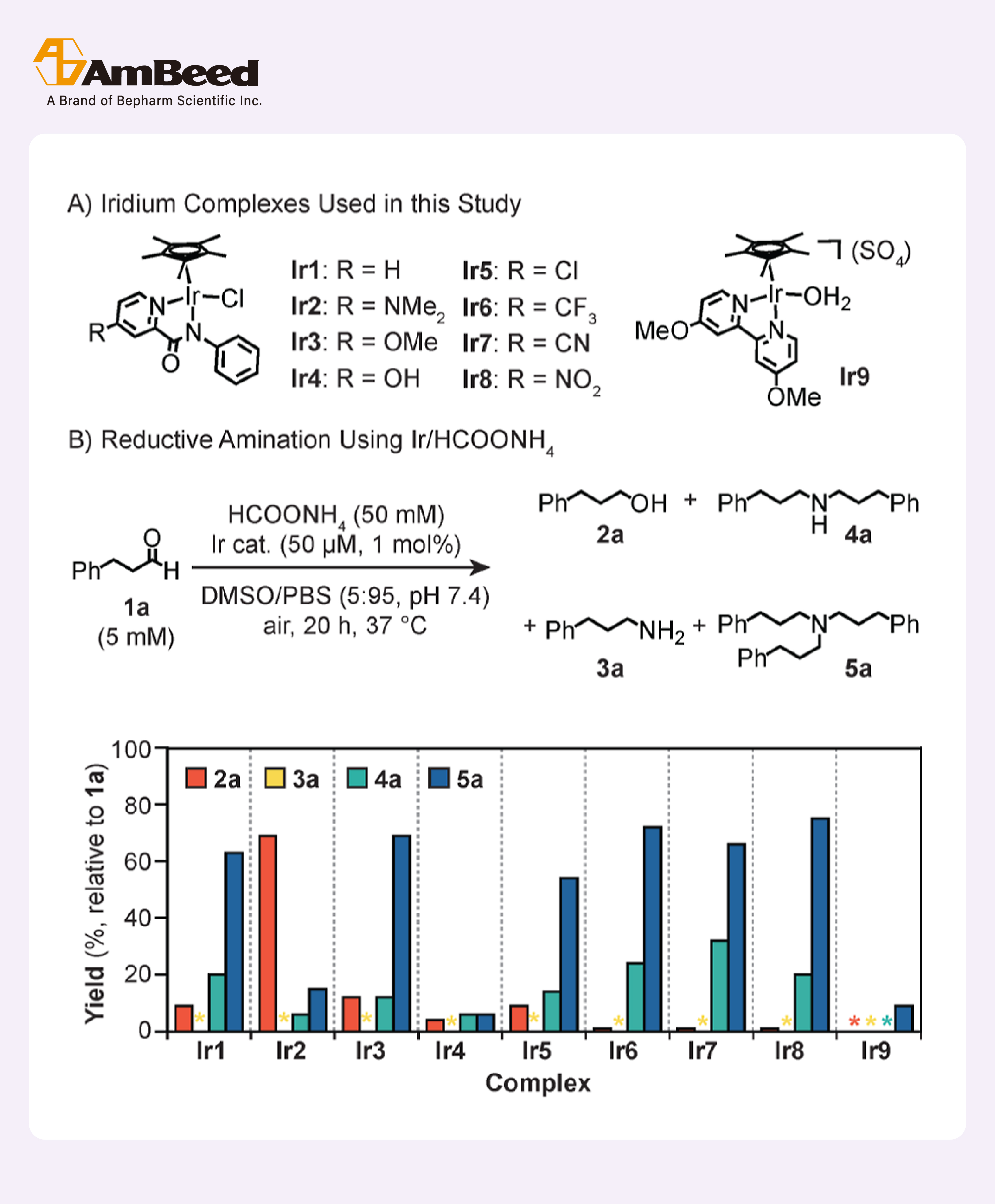 ·Product distribution: The product distribution of the reaction of aldehyde 1a with HCOONH4 under standard reaction conditions (DMSO/PBS, 37 °C, 20 h) over different iridium catalysts was compared by gas chromatography (GC). The results showed that electron-deficient catalysts (such as Ir6, Ir7, Ir8) mainly produced 2° and 3° amines, while electron-rich catalysts (such as Ir2, Ir3, Ir4) produced more alcohols and 2°/3° amine mixed products.