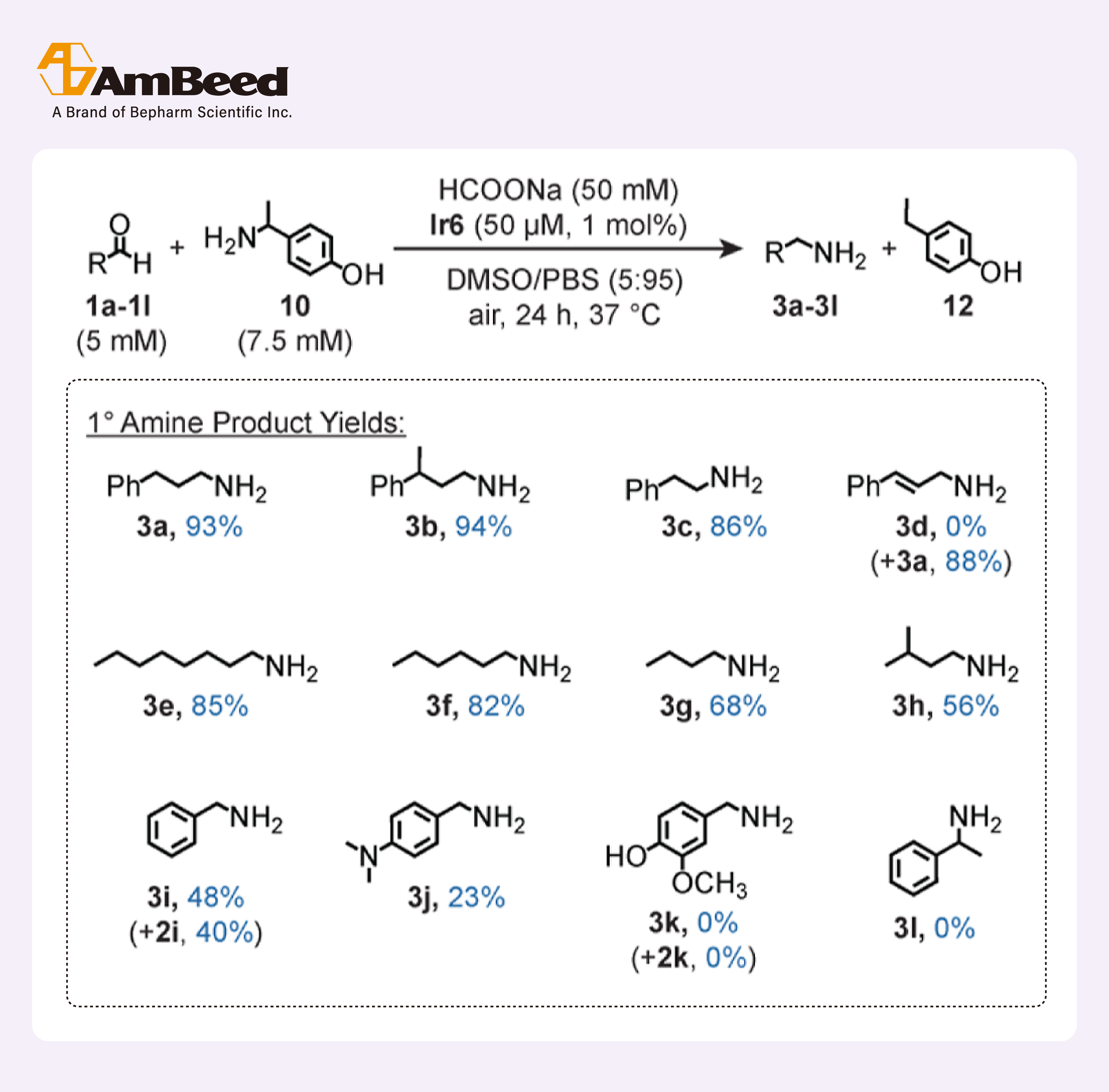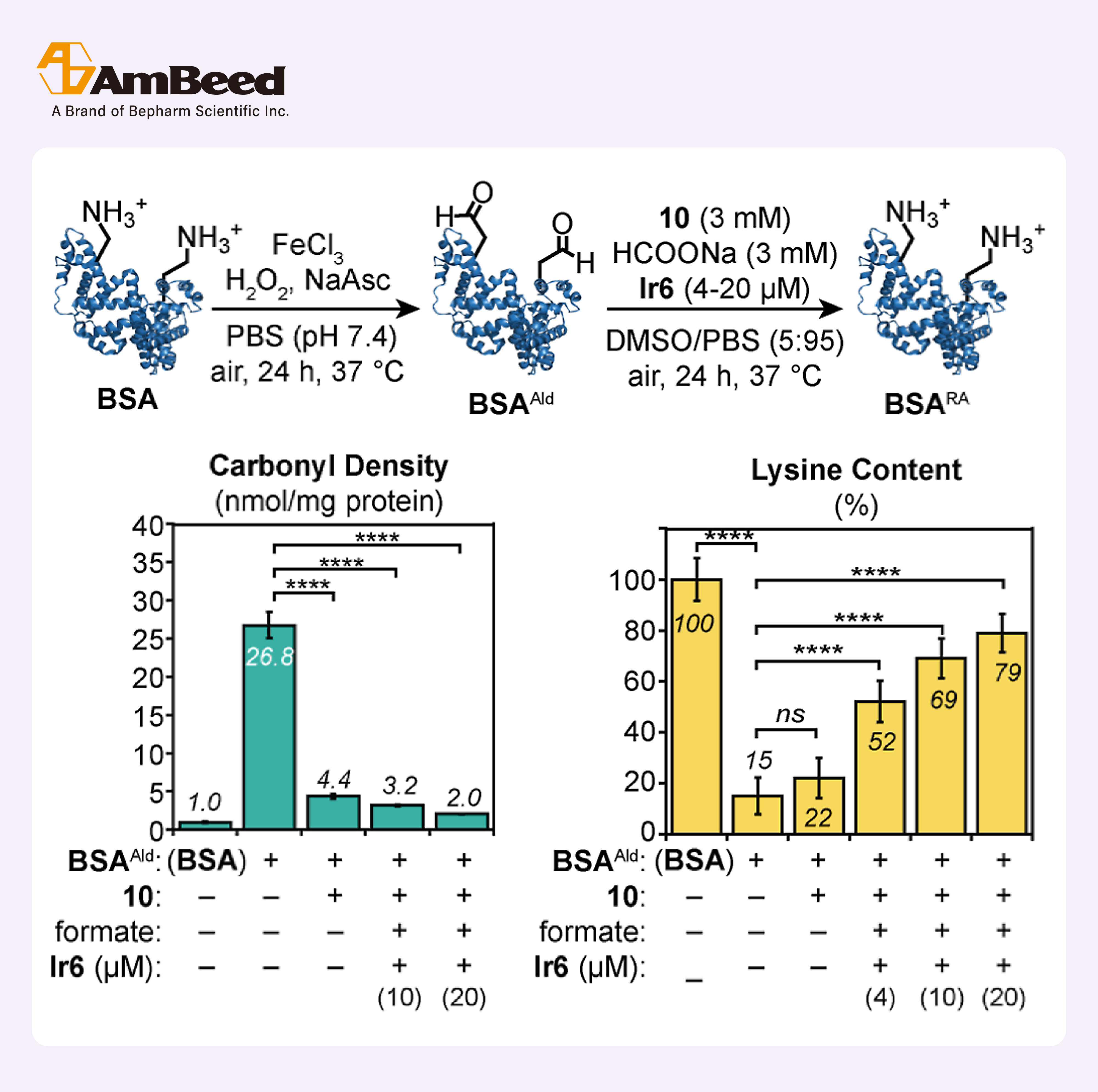 ·Oxidation and reductive amination of BSA: Allysine residues were introduced into bovine serum albumin (BSA) by oxidation treatment, and then reductive amination reaction was carried out using Ir6, HCOONa and 10. The results showed that the aldehyde group on BSA could be converted into 1° amine, and the presence of Ir6 was essential for the reaction.