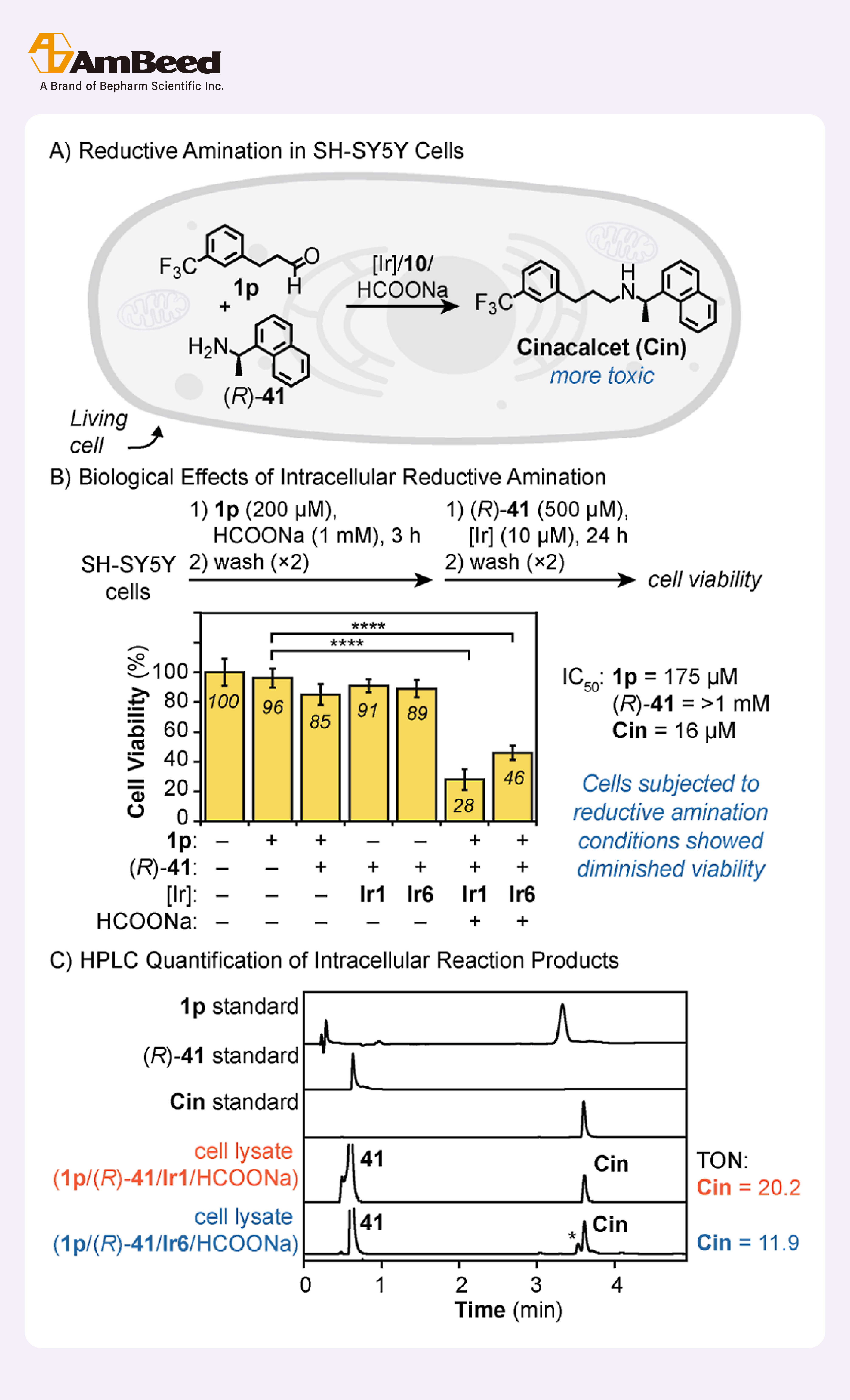 In SH-SY5Y cells, aldehyde 1p and (R)-41 were converted to cinacalcet by Ir-catalyzed reductive amination. The results showed that the reaction could reduce cell viability, indicating that the production of cinacalcet had an inhibitory effect on cells. The products of cinacalcet generated in cells were confirmed by HPLC analysis, and the turnover numbers (TONs) of Ir1 and Ir6 were calculated, which were approximately 20 for Ir1 and approximately 12 for Ir6, indicating that Ir1 was more active in the reaction.