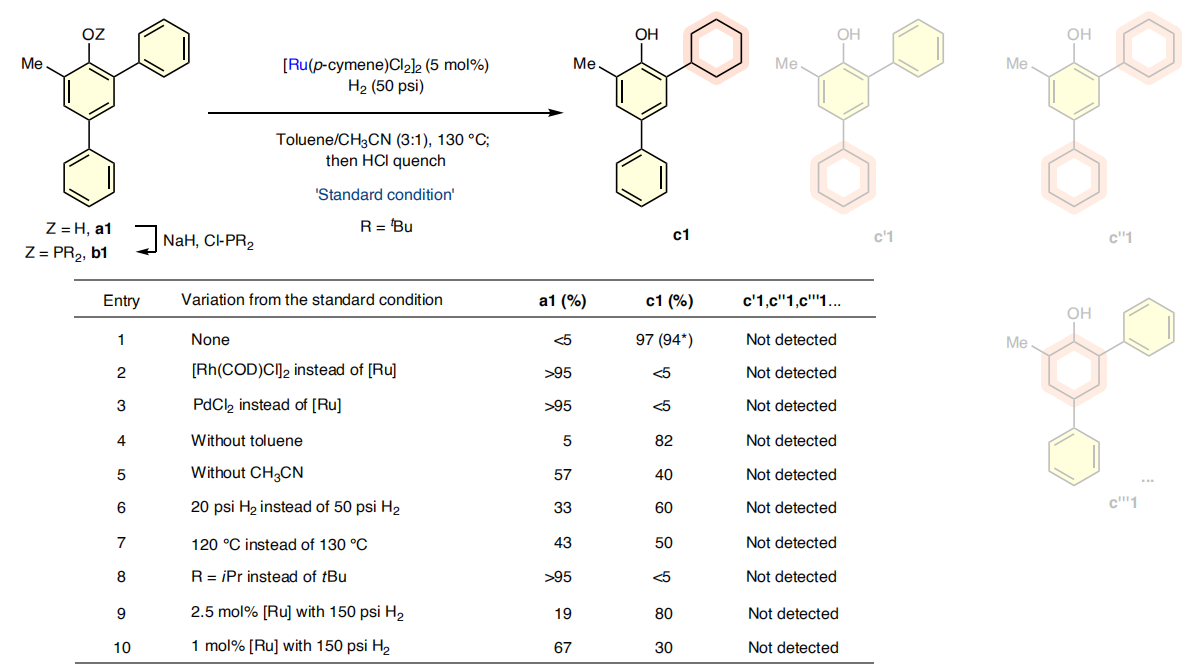 Through systematic optimization of the reaction conditions, the authors found that the uniqueness of the ruthenium catalyst and the specific reaction conditions are crucial for the successful implementation of directed hydrogenation (Fig. 2). Other transition metals (such as Rh and Pd) cannot replace the ruthenium catalyst; acetonitrile as a co-solvent has a significant impact on the reaction efficiency; the tert-butyl-substituted phosphinite directing group plays a key role in promoting the reaction, whereas the less bulky substituents (for example, isopropyl groups) are ineffective in directing the reaction.