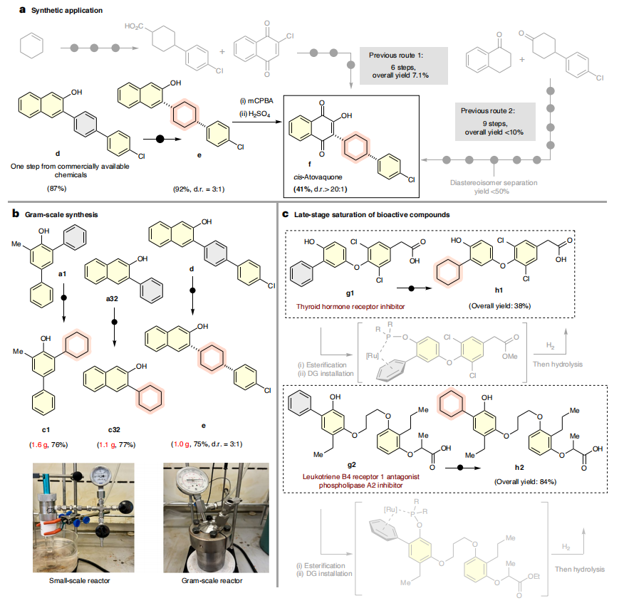 The synthetic utility of this method is fully demonstrated through three applications (Fig. 5): first, a streamlined synthesis of the cis-analogue of the antimicrobial agent atovaquone was achieved—starting from commercially available materials, the key precursor can be accessed in a single step, significantly shortening the conventional synthetic route that requires 6–9 steps; second, the reaction is scalable using normal Parr reactors, and good yields on three examples were obtained on gram scale; finally, owing to its high chemoselectivity, the method was successfully applied to the late-stage modification of two bioactive molecules—a thyroid hormone receptor inhibitor and a leukotriene B4 receptor 1 antagonist/phospholipase A2 inhibitor—selectively converting the phenyl group adjacent to the phenol OH into a cyclohexyl ring to afford sp³-enriched analogues.