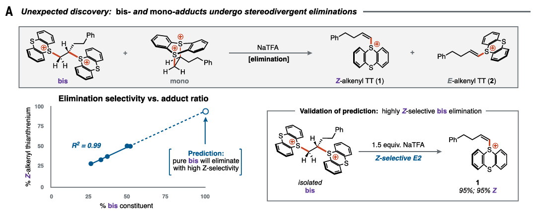 Under conventional reaction conditions, the bis-sulfonium adduct required for Z-selectivity is only a minor byproduct, while the mono-sulfonium adduct (mono-adduct) predominates as the major product, ultimately leading to the undesired E-alkene (Fig. 2B).