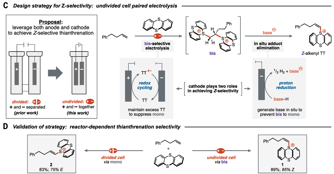 Fig. 2 (C) Design strategy for Z- selectivity: undivided cell paired electrolysis. (D) Validation of strategy: reactor- dependent thianthrenation selectivity.