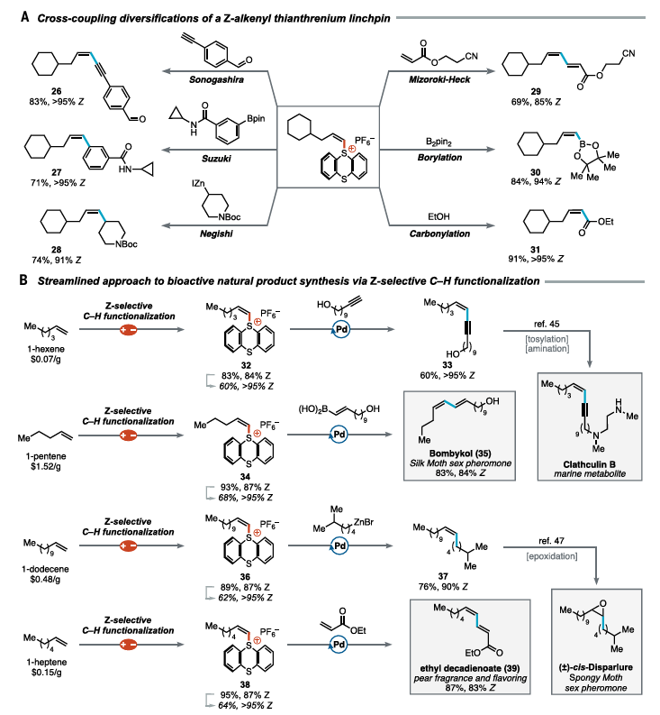 To highlight the synthetic utility, the authors selected several notable natural products—such as the silkmoth sex pheromone Bombykol, the spongy moth sex pheromone (±)-cis-Disparlure, and the pear fragrance component ethyl decadienoate—as target molecules. Starting from inexpensive, simple terminal alkenes, they efficiently synthesized these molecules in just two steps (Z-selective thianthrenation followed by a single cross-coupling step), demonstrating the power and simplicity of this strategy (Fig. 4B).