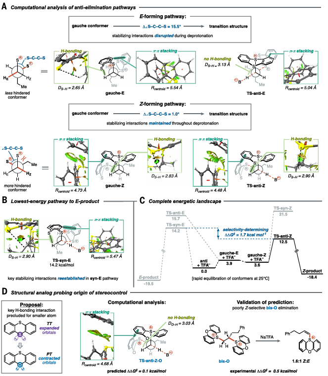To validate the critical role of hydrogen bonding, the researchers synthesized a structural analog of thianthrene (bis-O), where the neutral sulfur atoms were replaced with oxygen atoms. Theoretical predictions indicated that this subtle change would disrupt the critical C–H···S hydrogen bonding, leading to a significant reduction in Z-selectivity. Experimental results confirmed that the Z/E selectivity of the elimination products from bis-O indeed dropped substantially (to 1.6:1), providing strong support for the theoretical model (Fig. 5C).
