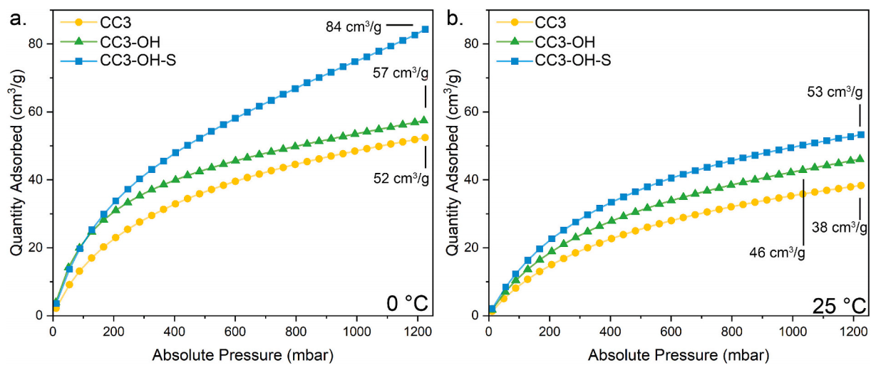 Abstract: The demand for low-cost, low-energy, and highly selective gas capture and separations is an ongoing driver of porous material development. Porous liquids have been identified as a promising gas separation material by creating permanent porosity in inorganic solvents through inclusion of nanoporous materials that sterically exclude solvent from their internal porosity. Among the nanoporous materials that can be used to form porous liquids, porous-organic cages (POCs) have been one of the most popular due to the inherent tunability of POCs. “Scrambled” POCs with varying functionalities on the POC vertices have been developed and incorporated into porous liquid compositions, increasing their gas adsorption capacity. An unexplored avenue to tailor the properties of porous liquids is through scrambling the functionality of the core of the POC. Therefore, we have synthesized a new POC, a CC3-OH derivative with scrambled hydroxides on the core and evaluated the impact on the CO2 uptake capacity in silicon oil-based porous liquids. Core scrambling of the POC resulted in a twofold increase CO2 adsorption capacity in the porous liquid, an emergent property that is a dramatic increase beyond a linear combination of the gas adsorption capacity of the neat solvent and the POC. Density functional theory modeling of the CC3 POC and its hydroxide-based derivatives identified that free rotation of the linker hydroxide allowed for forced interaction between the CO2 molecule and the hydroxide in the pore window. Solvation of the POC may release scrambled core hydroxides from intramolecular bonding with a neighboring imine, allowing for increased gas uptake in the porous liquid over the neat POC. These results identify a key structural relationship of POCs that enables emergent properties in porous liquids and can guide future development of liquid phase gas capture and separation materials for environmental and industrial applications.