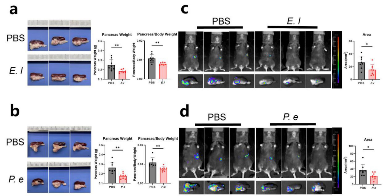 Abstract: Purpose: The gut microbiota has been implicated in the development and progression of pancreatic cancer (PC), yet few specific bacterial species have been reported to exert functional effect on PC. This study aimed to identify novel PC-associated gut bacterial species with tumor-regulatory effects and explore the potential molecular mediators of their effect. Methods: A bidirectional two-sample mendelian randomization (MR) analysis was performed using summary statistics from the MiBioGen consortium (n = 18,340) for gut microbiota and from the GWAS Catalog (587 PC cases, 455,761 controls) to assess their causal relationship. A two-step MR analysis incorporating blood metabolite data (n = 8,299 from the GWAS Catalog) was conducted to investigate potential mediation via circulating metabolites. Functional validation of identified bacterial taxa was carried out in murine models of PC via oral gavage of representative species. Results: Six bacterial taxa, including four genera, demonstrated reliable evidence of causal associations with PC. Eggerthella and Parasutterella were identified as protective for PC, whereas Sutterella and Coprococcus1 were associated with increased PC risk. Additionally, 26 blood metabolites showed causal associations with PC. After evaluating the causal relationships between PC-associated gut microbiota and blood metabolites, we found that the Eggerthella genus and Sutterella genus exert causal effect on PC by reducing the circulating levels of deoxycarnitine and hypotaurine, respectively. In two distinct orthotopic PC models, oral administration of Eggerthella lenta (E. lenta, the type species of the Eggerthella genus) or Parasutterella excrementihominis (P. excrementihominis, the type species of the Parasutterella genus) consistently exerted significant tumor-suppressive effects on the growth of pancreatic tumors. Moreover, E. lenta administration enhanced the infiltration of CD8⁺ T cells and NKT cells within orthotopic pancreatic tumors, suggesting a potential role of E. lenta in reshaping the tumor immune microenvironment to favor antitumor immunity. Conclusions: This study identifies E. lenta and P. excrementihominis as novel PC-associated gut bacterial species with tumor-suppressive effects, offering potential candidates for probiotic-based interventions in PC.