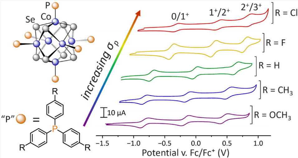 Abstract: Molecular “Chevrel-type” clusters of the formula Co6Se8L6 (L = neutral ligand) are a well-studied class of clusters due to their utility as molecular analogues to the Chevrel extended solid phase and their application as subunits in hierarchical materials. However, their solution and optical properties remain relatively underexplored. Aiming to develop the fundamental relationships between the molecular and electronic structures of these clusters and their electrochemical and photophysical properties, this work reports the preparation of a series of Co6Se8(P(C6H4R)3)6-type clusters with R = Cl (1), F (2), H (3), CH3 (4), and OCH3 (5) via a stepwise synthetic approach. Solution and solid-state experimental characterization and density functional theory calculations reveal that the Co6Se8 cores of 1−5 maintain consistent electronic and structural properties despite the variation of the triarylphosphine ligand para-substituent Hammett parameters (σp). However, cyclic voltammetry measurements indicate that the electron transfer energetics of 1−5 are strongly influenced by ligand substitution, with the E1/2 of a given redox event spanning ∼0.5 V depending on the triarylphosphine ligand’s σp. These findings support the characterization of Co6Se8 clusters as atomically precise nanoclusters with both the structural robustness and the electrochemical tunability needed to act as components in larger charge transfer assemblies.