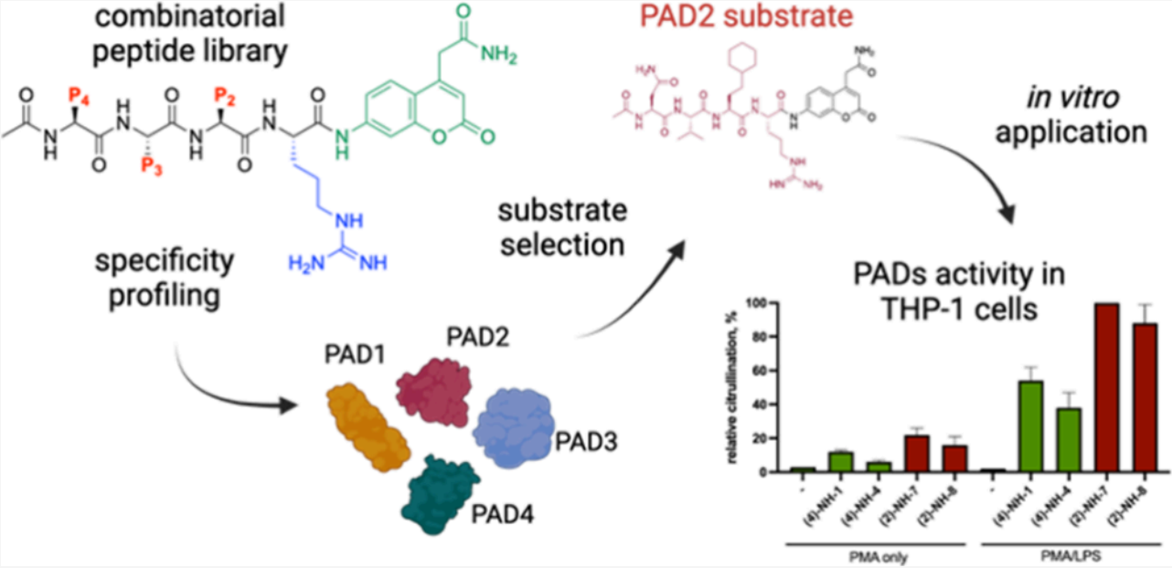 Abstract: Peptidylarginine deiminases (PADs) catalyze the calcium-dependent conversion of arginine to citrulline, which affects diverse cellular processes. Among the human PAD isoforms, PAD2 and PAD4 are particularly relevant because of their distinct tissue distributions and substrate preferences. However, the lack of isoform-selective substrates has limited our ability to discriminate between their activities in biological systems. In this study, we developed PAD2- and PAD4-selective fluorogenic peptide substrates using the Hybrid Combinatorial Substrate Library (HyCoSuL) strategy, which incorporates both natural and over 100 unnatural amino acids. Substrate specificity profiling at P4–P2 positions revealed that PAD2 tolerates a broader range of residues, particularly at the P2 position, whereas PAD4 displays more selective preferences, favoring aspartic acid at this site. Based on these insights, we designed and validated peptide substrates with high selectivity for PAD2 or PAD4, enabling isoform-specific kinetic analysis in vitro. We demonstrated the utility of these substrates in profiling PAD activity in THP-1 macrophages, revealing dominant PAD2 activity in PMA (phorbol 12-myristate 13-acetate)/LPS (lipopolysaccharide)-stimulated monocytes. Furthermore, PAD4-mediated citrullination of vimentin modulates its susceptibility to caspase and calpain cleavage, potentially altering its function as a damage-associated molecular pattern (DAMP). Our findings provide a framework for the development of PAD-selective inhibitors and chemical probes, enabling the precise dissection of isozyme-specific PAD functions in health and disease.