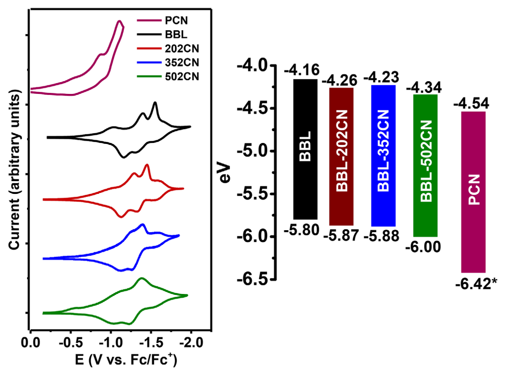 Abstract: N-type conjugated ladder polymers without side chains, such as BBL, have been shown to exhibit record-high mixed ionic-electronic transport properties, which have enabled diverse device applications. This study reports herein the design and synthesis of a series of dicyano-functionalized n-type conjugated ladder copolymers, BBL-x2CN, as new organic mixed ionic-electronic conductors (OMIECs). By combining the cyanation and random copolymerization design motifs, this study demonstrates that the electronic band structure (LUMO/HOMO energy levels) can be effectively tuned as a function of the copolymer composition of the dicyano functional group without compromising the unique planar polymer backbone intrinsic to BBL-type ladder polymers. Optimal mixed ionic-electronic transport properties probed via organic electrochemical transistors (OECTs) are found in BBL-202CN (20 mol%) devices that feature a high transconductance (≈3 mS), a good µC* value (≈2.8 FV−1cm−1s−1), and a fast transient response (τon/τoff = 40 ms/12 ms), which are substantially enhanced compared to those of the parent BBL of comparable molecular weight. The better OECT device performance found in BBL-202CN copolymer, compared to other copolymers, can be explained by a combination of improved crystallinity, delocalization length, and suppressed conformational disorder. These results provide new structure-property relationships with implications for the molecular engineering of high-performance n-type OMIECs.