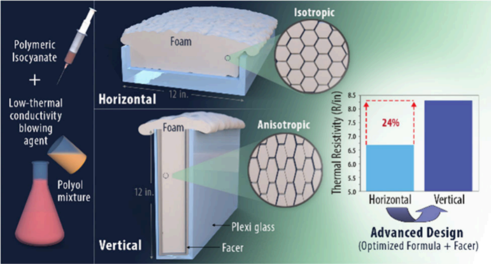 Abstract: Developing high-performance thermal insulation is vital for addressing the ongoing global demand for reduced energy costs. Polyisocyanurate (PIR) foams are commonly used in residential and commercial buildings and in various industrial applications owing to their relatively high thermal insulation properties and fire resistivity. This study aims to further improve the thermal resistivity of PIR foams by (1) incorporating low thermal conductivity blowing agents; (2) tailoring the anisotropy of their cells; (3) tuning polymeric isocyanate quantities; and (4) incorporating a facer barrier, while using steps that easily integrate into current manufacturing processes for PIR foams. The resulting PIR foams exhibit a significant enhancement in thermal resistivity, achieving initial values as high as 8.3 h·ft2 ·°F/Btu/in., commonly abbreviated as R-8.3/in., which is a 20% improvement compared with that of commercially used PIR foams that achieve approximately R-7/in. The detailed analysis of thermal conductivity measurements, mechanical testing, and morphological characterization elucidates the structure−property relationships. The developed high-performance PIR foams provide a critical pillar for next-generation high-performance insulation, offering promising thermal insulation for buildings and many other applications that have a significant effect on global energy costs.