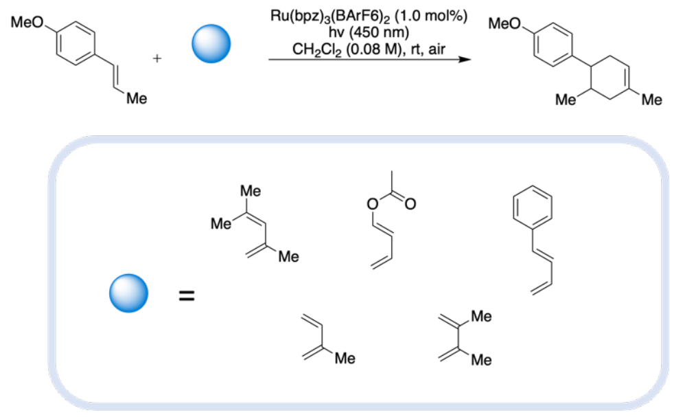 Abstract: Photoredox catalysis has become increasingly significant in academic and industrial processes, replacing harsh reaction conditions and high temperatures with visible light. With only a small group of reactions that display chain characteristics, we are still unsure of how prevalent photochemical chain reactions are or how to tune a reaction to proceed through this specific mechanism. Spectroscopic and photochemical analytical techniques are increasingly integral to enhancing our understanding of modern and classical organic transformations. These and other studies have revealed information imperative for extrapolating the kinetics of these systems. Increasing our understanding of these chain reactions in photochemistry provides a promising avenue to increasing efficiency for these reactions, especially when scaling up reactions that have been exclusively performed in the academic research labs. Our current investigation aims to further elucidate the photochemical chain mechanism, specifically the factors influencing its success in the Ru-catalyzed Diels-Alder cycloaddition. Our focus centers on Ru(II) catalyzed [4+2] cycloaddition reaction. Following our kinetic characterization for the cycloaddition between anethole and isoprene, this study explores the substrate scope for sucessful chain propagation and the imapct of electron upconversion, previously described by Alabugin and coworkers. Mechanistic studies were performed utilizing transient absorption spectroscopy (TAS) in combination with quantum yield measurements and computational analysis to measure the chain lifetime and recognize the connection of this [4+2] cycloaddition to electron upconversion.