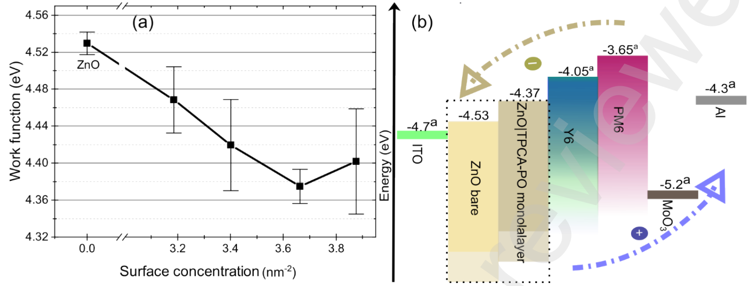 Abstract: Precise control over functional layers at the molecular level is essential for advancing high-performance optoelectronic devices. This study demonstrates a novel approach to tailoring the electronic and surface properties of zinc oxide (ZnO), a widely used electron transport layer (ETL), via the Langmuir-Schaefer (LS) technique. A linearly π-conjugated amphiphilic molecule, 4''-(pentyloxy)-1,1':4',1''-terphenyl-4-carboxylic acid (TPCA-PO), was employed to form highly ordered monolayers at the air–water interface. The molecular packing behavior was characterized using in-situ surface pressure–mean molecular area isotherms and Brewster Angle Microscopy (BAM), confirming the formation of densely packed Langmuir layers at the air-water interface. These layers were transferred onto ZnO layer by varying surface concentrations, resulting in a significant reduction of work function (up to 160 meV), attributed to interfacial dipole formation. Contact angle measurements further revealed increased surface hydrophobicity, suggesting improved stability under ambient conditions and enhanced compatibility with hydrophobic active layers. Although only marginal improvements in device performance were observed for PM6:Y6 inverted organic solar cells, the surface modifications highlight the potential of LS-based processing for energy level tuning and long-term stability enhancement in optoelectronic devices.