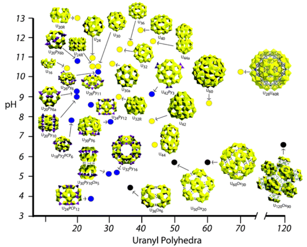 Abstract: Uranium (U) separation from spent nuclear fuel is an area of current research interest as reprocessing and advanced fuel development are important for fully utilizing nuclear energy resources. Currently reprocessing requires dissolution of UO2 fuel pellets in nitric acid mediawhich yields the U(VI)O22+ cation which can be separated via the PUREX process. However; radiolysis of aqueous solution can generate reactive oxygen species (ROS) such as •OH, O2•-, e–(aq) , •H, and H2O2 that cause extractant degradation and the high concentrations of HNO3 are severe explosion, corrosion, and fire hazards. An alternative to this process is a CARBonate EXtraction method, termed CARBEX that in several studies has show to both be capable of dissolving and extracting U from UO2 in an elevated pH (pH = 7-10). Problems may arise though from large amounts of H2O2 added to aid in dissolution that will also generate ROS through H2O2 decomposition. This thesis intends to further understand solution state speciation and ROS interactions with UO22+ at similar pH conditions. Hydrothermal and photochemical synthetic methods were used for generating and in a few cases binding ROS with UO22+ through H2O2 decomposition. In general, hydrothermal and photochemical reactions both can produce UPCs while photochemical reactions were also found to produce peroxide dimers. All compounds were structurally characterized using single crystal X-ray diffraction and vibrational modes were assigned using Raman and infrared spectroscopies. ROS were first detected via a colorimetric assay and further characterization of the radical species required electron paramagnetic resonance spectroscopy (EPR) studies. Free radical identification was done using spin trapping methods in aqueous solutions where •OH and O2•-were found to be present in UPCs and O2•-. Only O2•- was found to be stable within UPCs while •OH caused a loss of crystallinity overtime seen during x-ray diffraction studies.