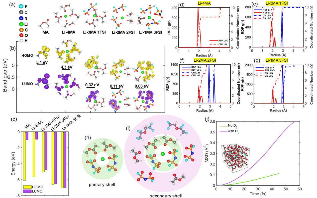 Abstract: Methyl acetate (MA) is a promising solvent due to its strong oxidative stability, low viscosity, and extremely low freezing point; however, its application is limited by poor compatibility with graphite. This study introduces a novel MA-based electrolyte with enhanced performance across a wide temperature range by modulating Li+–MA interactions through non-solvating mechanisms, thereby tailoring the solvation structure to enable low-temperature operation. The engineered electrolyte exhibits excellent compatibility with both graphite and Li-rich Nickel Manganese Cobalt (LiNMC) cathodes and remains in a stable liquid state down to −80 °C. A non-solvating fluoroether co-solvent is incorporated to compete with Li+ and partially disrupt MA solvation during graphite lithiation, enhancing desolvation efficiency and lowering desolvation energy. At optimized concentrations, this co-solvent promotes anion integration into the Li+ solvation shell, increasing the presence of free solvent molecules, contact-ion pairs (CIPs), aggregates (AGGs), and nanometric aggregates (n-AGGs). These changes reduce the band gap between LUMO and HOMO in the solvation shell, facilitating its reduction and promoting SEI formation via FSI− decomposition. Consequently, LiNMC/graphite cells retain over 90 % of their initial capacity after 150 cycles at −60 °C, while LiNMC811/graphite cells deliver a record-high capacity of 149.3 mAh/g.