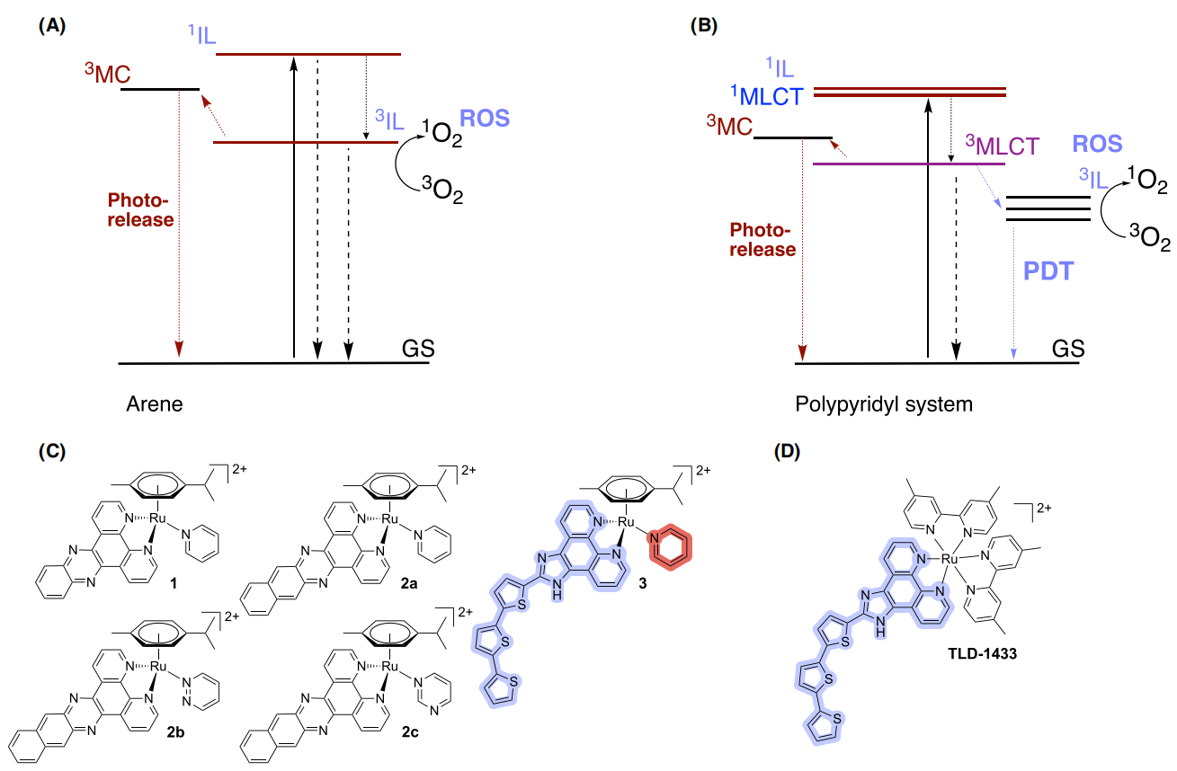 Abstract: Phototherapy approaches include photodynamic therapy (PDT), which utilizes chemically stable photocatalysts to sensitize the conversion of endogenous molecules such as oxygen (O2) to form transient reactive species such as 1O2, and photopharmacology, a complementary approach that relies on molecules that undergo self-modifying photochemistry, such as bond cleavage reactions or isomerization, for the creation of biologically active products. While Ru(II) polypyridyl systems have demonstrated utility for both approaches, related organometallic systems are relatively less explored. Here, the photochemistry and photobiological responses were compared for five Ru(II) arene compounds containing photolabile monodentate azine ligands and the π-expansive bidentate ligands dipyrido[3,2-a:2′,3′-c]phenazine (dppz), 4,5,9,16-tetraaza-dibenzo[a,c]naphthacene (dppn), and α-terthienyl-appended imidazo[4,5-f][1,10]phenanthroline (IP-3T). The compounds demonstrated significant light-mediated photocytotoxicity in lung cancer and melanoma cell lines, with up to 6000-fold increases in cytotoxicity upon irradiation. The arene systems were capable of partitioning between different excited state relaxation pathways, both releasing the monodentate ligand and generating 1O2, but with notably low yields that did not correlate with the photocytotoxicity of the systems. The organometallic compounds exhibit less mixing of the metal-associated and ligand-centered excited states than analogous polypyridyl coordination compounds, providing a structurally, photochemically, and photobiologically distinct class of compounds that can support both metal- and ligand-centered reactivity.