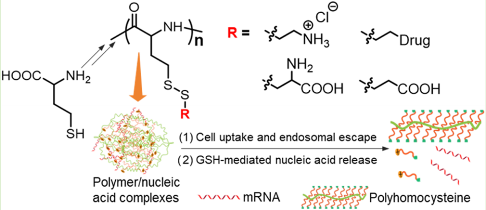 Abstract: Disulfide-containing synthetic polypeptides hold significant promise as biodegradable and biocompatible carriers for controlled drug and gene delivery, enabling triggered therapeutic release with reduced cytotoxicity. However, disulfide incorporation remains challenging, whether through direct polymerization of disulfide-containing monomers or postpolymerization modification. In this work, we present an innovative and simple strategy to incorporate disulfide bonds into polypeptides using ring-opening polymerization of the N-carboxyanhydride of homocysteine, a thiol-containing amino acid. The polymerization was well-controlled, yielding repeating units up to 100 with narrow dispersity. The pendant side chains were readily converted into various GSH-responsive moieties, including anionic, neutral, zwitterionic, and cationic groups, as well as therapeutic agents toward a wide range of biomedical applications. The drug-loaded amphiphilic polymer-drug conjugates displayed triggered release of intact drug and potent anticancer activities. Furthermore, cationic polyhomocysteine derivatives effectively delivered siRNA, eGFP mRNA, and more complex CRISPR components with extremely low cytotoxicity and excellent transfection efficiency.