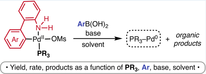 Abstract: This article describes a detailed interrogation of the initiation step (reduction of PdII to Pd0) for Buchwald’s G3 palladium precatalysts and derivatives thereof. These studies demonstrate that under Suzuki–Miyaura cross-coupling conditions, the cyclometalated PdII complexes initiate to form a mixture of two organic products: carbazole (via intramolecular C(sp2)–N coupling) and biaryl (via intermolecular C(sp2)–C(sp2) coupling with the arylboronic acid substrate). The overall yield and rate of initiation, as well as the organic product ratio, vary dramatically as a function of the phosphine ligand, base, solvent, and boronic acid structure. Implications of these results for catalysis are discussed, and the findings are applied to a different class of cyclometalated precatalysts. Overall, this work shows that precatalyst activation is highly condition-dependent and that this step should be a key consideration in the optimization of Pd-catalyzed cross-coupling reactions.