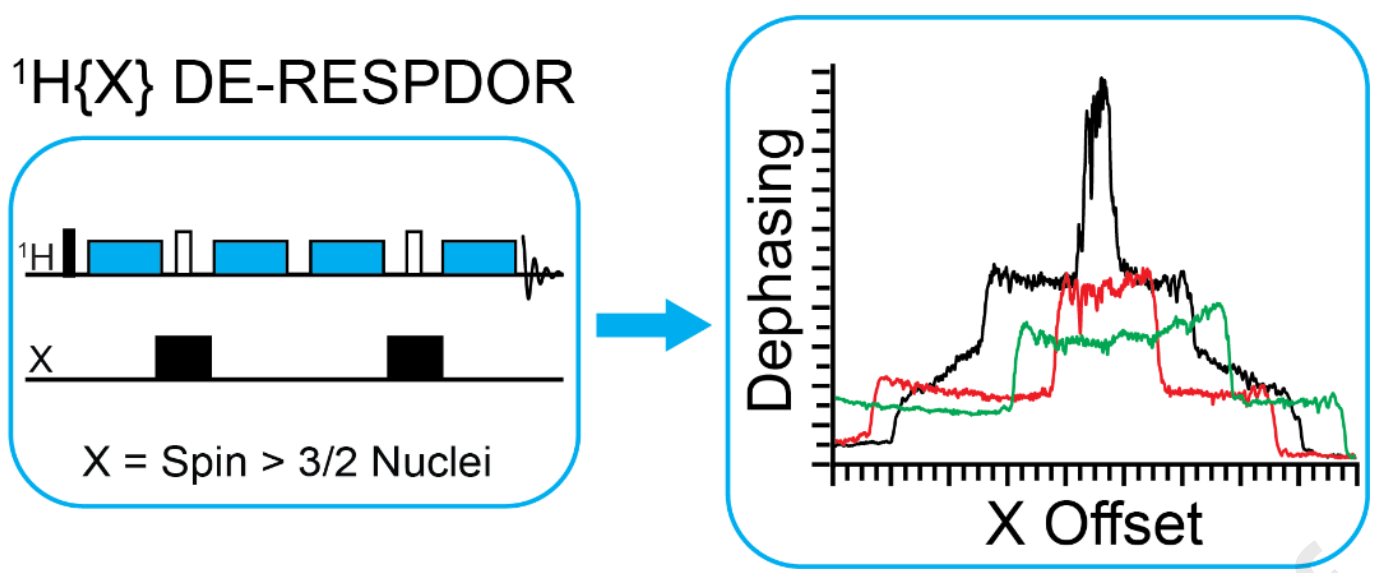 Abstract: Quadrupolar nuclei with a nuclear spin I > 1/2 account for ~73% of all NMR-active nuclei. The quadrupolar interaction broadens the solid-state NMR signals, frequently resulting in low resolution and poor sensitivity. Here, we present a theoretical and experimental investigation of the use of magic angle spinning (MAS) 1H{X} double-echo resonance-echo saturation-pulse double-resonance (DE-RESPDOR) solid-state NMR experiments for the indirect detection of n half-integer quadrupolar nuclei with spin > 3/2 (spin 5/2, 7/2, or 9/2 nuclei). In these experiments, plotting the observed dephasing of the detected spin as a function of the transmitter offset of the indirectly detected spin allows for the reconstruction of the spectrum of the quadrupolar nucleus. The achievable dephasing levels and the lineshapes of solid-state NMR spectra of the indirectly detected nuclei were predicted using numerical simulations. We demonstrate 1H detection of 127I (I = 5/2), 139La (I = 7/2), and 115In (I = 9/2) nuclei in BaI2.2H2O (barium iodide dihydrate), La(BH4)3(THF)3 (tris(borohydride)tris(tetrahydrofuran)lanthanum(III)), and In(OH)3 (indium(III) hydroxide), respectively. The observed improvements or reductions in sensitivity with indirect detection are related to the proportion of 1H T1 to quadrupolar nucleus T1, alongside the quadrupolar nucleus's spin quantum number and gyromagnetic ratio (γ). Additionally, the indirect detection experiments confirm the existence of dipolar or scalar couplings between the detected nucleus and the quadrupolar nucleus of interest, providing important structural information. Numerical simulations suggest these methods are also potentially applicable to quadrupolar nuclei having large quadrupolar coupling constants.