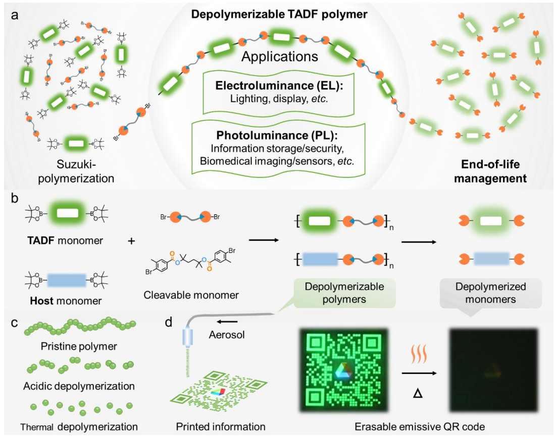 Abstract: The growing environmental impact of plastic pollution has intensified the demand for sustainable polymer systems that combine high performance, processability, and environmental responsibility. This thesis presents innovative molecular design strategies for creating functional and recyclable polymers by integrating synthetic chemistry with emerging tools in artificial intelligence (AI). First, a series of luminescent polymers based on the thermally activated delayed fluorescence (TADF) mechanism were synthesized by incorporating cleavable tert-butyl ester groups into the polymer backbones, enabling controlled depolymerization and refunctionalization without compromising light-emitting efficiency. Beyond electroactive materials, the second part addresses the recycling challenges of traditional plastics, particularly the poor compatibility of mixed polymer waste. To overcome this, universal linkers containing reversible dynamic bonds and azide end groups were developed to chemically bond with inert polymers, forming compatible phases within immiscible polymer blends. These linkers significantly improved mechanical properties and enabled multiple cycles of mechanical recycling with minimal performance loss. In the final section, AI and automation were applied to accelerate the discovery of electrochromic polymers (ECPs) through a closed-loop platform that integrates machine learning (ML), predictive modeling, and robotic synthesis, enabling efficient inverse design and rapid material development. Collectively, this work demonstrates how smart molecular design, dynamic bonding strategies, and AI-driven discovery can be combined to advance sustainable materials, supporting the vision of a circular polymer economy.