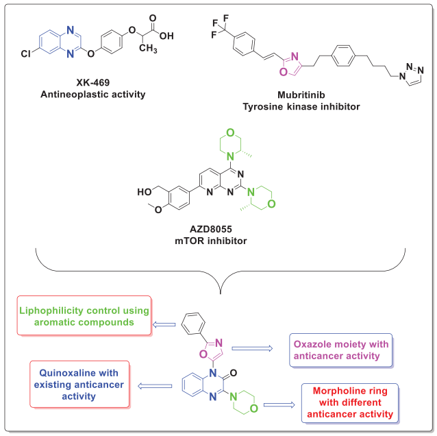 Abstract: In this paper, we report the synthesis of targeted quinoxaline-oxazole-morpholino conjugates (5a–n) in a conventional three-step procedure from 3-chloroquinoxalin-2(1H)-one. The anti-cancer activity was assessed against two human cancer cell lines, including MCF-7 (breast) and HepG2 (liver), using the MTT assay method. In this study, Erlotinib was used as the standard drug. The anticancer activity results show that the compounds5g (MCF-7 = 1.20 ± 0.10 and HepG2 = 1.04 ± 0.05 μM), 5f(MCF-7 = 1.29 ± 0.10 and HepG2 = 1.10 ± 0.06 μM), and 5e(MCF-7 = 1.72 ± 0.10 and HepG2 = 1.45 ± 0.12 μM) exhibited more potent anticancer activity as compared to the standard drug Erlotinib. In a cell survivability test (MCF-10A), all the three potent compounds (5g, 5f, and 5e) were evaluated against thenormal breast cell line, although neither of them displayed any significant cytotoxicity with IC50 values greater than 88.02 μM.In addition to this, molecular docking studies of compounds 5g, 5f, and 5e demonstrated that these compounds had moreEGFR-binding interactions. The potent compounds were further screened for their in vitro tyrosine kinase EGFR inhibitory activity using Erlotinib as the reference drug. The two compounds,5g and 5f, display the highest tyrosine kinase EGFR inhibitory potency than the reference Erlotinib. The active compounds 5g,5f, and 5e were subjected to in silico pharmacokinetic assessment by SWISS, ADME, and pkCSM. The three compounds, 5g, 5f, and 5e, followed Lipinski, Veber, Egan, and Muegge rules without any deviation.