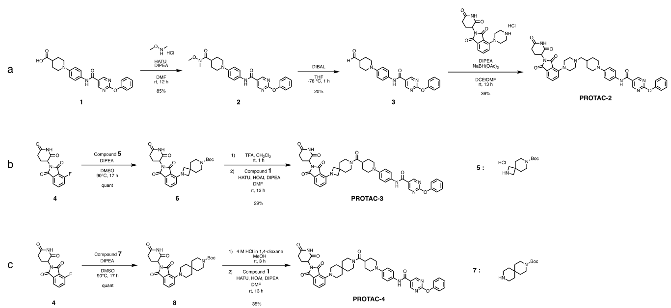 Abstract: Proteolysis-targeting chimeras (PROTACs) are emerging as powerful tools for targeted protein degradation. Among the key factors influencing their efficacy, linker design plays a critical role by affecting membrane permeability, ternary complex formation, and degradation potency. In this study, we conducted a comparative analysis of three novel PROTACs targeting hematopoietic prostaglandin D synthase (H-PGDS), each incorporating linkers with distinct degrees of rigidity—including methylene modifications and spirocyclic structures. Although all compounds exhibited similar binding affinities and degradation activities, the most rigid derivative (PROTAC-3) showed markedly higher intracellular accumulation but formed the least stable ternary complex. These results reveal a trade-off between cell permeability and complex stability, emphasizing the importance of comprehensive linker optimization. Our findings highlight the value of integrating conformational rigidity and spatial design in the rational development of next-generation PROTACs.