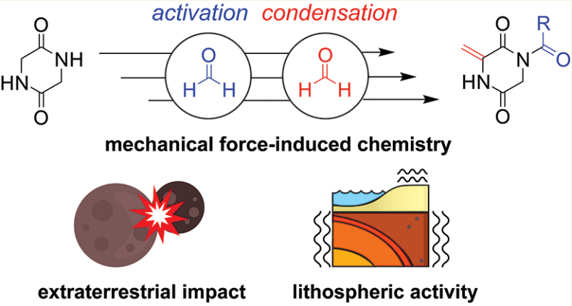Abstract: Signal transduction by gaseous small molecules is an essential process in modern living systems, where the gasotransmitters relay cellular signals to bio(macro)molecules through covalent bond formation. However, the origin or a primordial version of such signaling events in abiotic worlds has been poorly understood to date. Through examination of chemical reactivities between formaldehyde and cyclic dipeptide/diketopiperazine derivatives in prebiotically relevant solid-state environments, this study demonstrates that the gaseous small molecule may serve not only as a mere building block for the abiotic construction of biomolecules but also as an activating agent that transforms the inert peptide into reactive, prebiotically important chemical species. In addition, superiority of solid-state reactions or mechanochemistry to solution-based reaction conditions described in this article may be an indication of potential significance of the mechanical force-induced chemistry for chemical evolution, in particular for abiotic emergence of polypeptides.