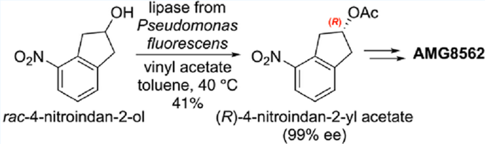 Abstract: The transient receptor potential vanilloid-1 (TRPV1) channel is a key mediator of pain perception and responds to various stimuli such as heat, low pH, and inflammation. Among TRPV1 antagonists, (R,E)-N-(2-hydroxy-2,3-dihydro-1H-inden-4-yl)-3-(2-(piperidin-1-yl)-4-(trifluoromethyl)phenyl)-acrylamide (AMG8562) shows promise as a nonopioid analgesic, attenuating pain behaviors in rodent models without eliciting hyperthermic side effects commonly associated with other TRPV1 antagonists. Despite its potential, there has been limited research regarding the synthesis of AMG8562. Here, we present an asymmetric synthesis of AMG8562 featuring a lipase-catalyzed kinetic resolution of racemic 4-nitroindan-2-ol. This approach enables scalable access to enantiomerically pure material and provides a platform for the synthesis of structurally diverse AMG8562 analogues with potential for improved pharmacological properties.