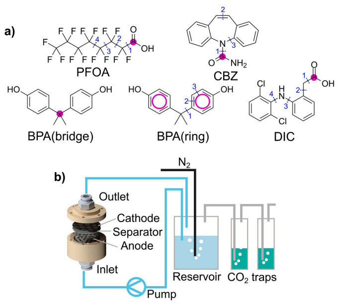 Abstract: To address the need for sustainable wastewater treatment, we developed sp2-carbon-rich, hierarchically porous electrodes by upcycling sewage sludge ash (SSA) and biochar (CB) using a hybrid 3D printing and microwave plasma-enhanced chemical vapor deposition (MPECVD) approach. The CB-containing electrode exhibited a 260-fold increase in BET surface area (0.15 to 40.6 m2 g−1), but the lowest electrochemically active surface area (EASA = 18.3 cm2 g14), indicating limited site accessibility. In contrast, SSA-based electrodes offered both higher BET and EASA values (up to 328.6 cm2 g14), improving adsorption and oxidation performance. Electrochemical oxidation of 14C-labelled micropollutants (BPA, diclofenac, carbamazepine, and PFOA) exhibited pollutant-specific removal pathways. SSA electrodes enhanced BPA adsorption and mineralization, achieving a 1.6-fold faster 14CO2 production rate. While CBZ and DIC were partially mineralised, no measurable 14CO2 formation was observed for PFOA, suggesting a different removal mechanism. An inverse correlation was observed between mineralization rates and DFT-calculated bond cleavage energies. These findings highlight the practical potential of upcycled electrodes to achieve efficient mineralization of persistent organic pollutants. This closed-loop strategy offers an environmentally viable approach to turning waste into functional materials for advanced wastewater treatment processes.