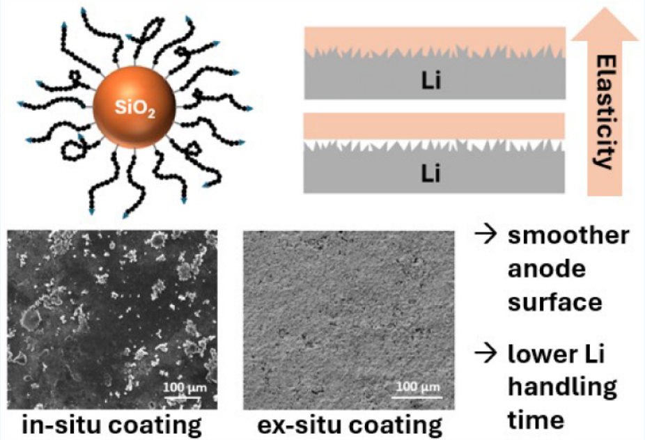Abstract: Due to their impressive energy density, lithium-metal batteries have great potential to replace the widely used lithium-ion batteries. However, some challenges, like dendrite growth and the formation of “dead” lithium, still hamper their industrial application to this day. Artificial solid electrolyte interfaces (aSEIs) provide a protective coating on lithium electrodes to enforce uniform lithium stripping/plating. Especially, poly(ethylene glycol)-based polymers are promising due to their high ionic conductivity, but a challenge remains in their lack of mechanical strength. By grafting these polymers from inorganic nanoparticles, such as silica, the high ionic conductivity can be combined with the mechanical strength of the nanoparticles. The physicochemical properties of these bottlebrush particles (BBPs) are determined by the grafting density (GD), inorganic fraction, and molecular mass of the grafted polymer chains. Each of these parameters has a significant influence on the materials’ mechanical and conducting properties. In this work, each of these parameters and their effect on performance as aSEIs for lithium-metal anodes were studied. While high-molecular mass and grafting densities with low inorganic fractions can increase ion conductivity, as well as the mechanical strength of the material, unwanted elevated polarization was observed. Conversely, low GD samples provided significant enhancement of mechanical strength but reduced ionic conductivity. Overall, intermediate GD of 0.23 chains nm-2, high inorganic fraction of ca. 10 wt %, and intermediate molecular mass of ca. 100,000 g mol-1 provided the optimal balance for the tested BBPs of ionic conductivity, mechanical properties to prevent dendrite formation, as well as reduced polarization.