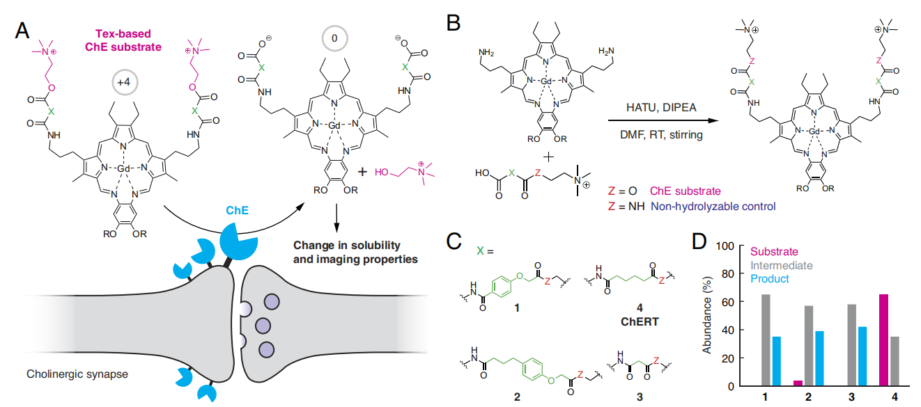 Abstract: Cholinesterase (ChE) enzymes terminate action of the neurotransmitter acetylcholine at synapses and neuromuscular junctions throughout the body. Noninvasive strategies for monitoring these enzymes could be important for studying basic biology of cholinergic systems and disorders that affect their function. To address this goal, we developed an imaging probe that allows activity of ChE to be detected using MRI. The probe, called ChERT, undergoes enzymatic processing that reduces its solubility, promoting accumulation near sites of cholinesterase activity. Following wide-field brain delivery, ChERT produces MRI contrast changes in brain regions known to be enriched in cholinesterases; these are suppressed in the presence of a selective enzymatic inhibitor, confirming their specificity. After abdominal delivery, ChERT labels regions of the gut where ChE expression is expected. In both the brain and periphery, colocalization of ChERT with ChE could be confirmed and visualized at higher resolution by fluorescence microscopy, owing to optical properties of the probe architecture. The ChERT agent thus provides a potentially versatile basis for assessment of cholinergic phenotypes throughout the body.