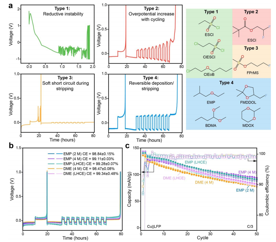 Abstract: Electrolyte development for next-generation batteries has largely relied on knowledge-driven trial-and-error. A significant reason for this approach is due to the vast, high-dimensional molecular design space for solvents and molecular mixtures. Popular dimensionality reduction techniques such as principal component analysis (PCA), t-distributed stochastic neighbor embeddings (t-SNE), and uniform manifold approximation and projection (UMAP) can facilitate chemical exploration by projecting this space into low dimensions, yet their applicability in electrolyte discovery remains underexplored. Here, we present a framework to assess the faithfulness of various dimensionality reduction methods in preserving chemically meaningful relationships. Then, we apply this framework to guide electrolyte solvent discovery by searching for electrolyte solvents with high cosine similarity to state-of-the-art systems, followed by formulation refinement using domain knowledge. We then performed experimental validation which revealed different failure modes for different electrolyte selections. We specifically focus on next generation lithium metal batteries (LMBs), and identified a non-fluorinated ether electrolyte solvent that exhibited high Coulombic efficiency (CE). Our findings demonstrate that rational navigation of the electrolyte chemical space, enabled by dimensionality reduction and guided by data, can complement traditional approaches and accelerate the discovery of advanced battery materials.