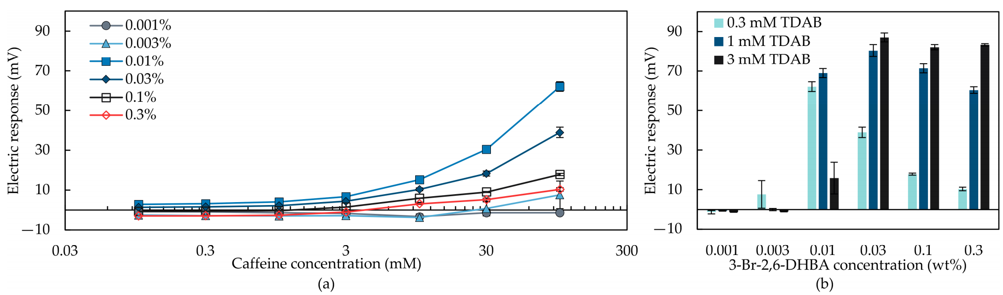 Keywords: taste sensor ; lipid ; polymer membrane ; allosteric mechanism ; caffeine detection ; surface modification