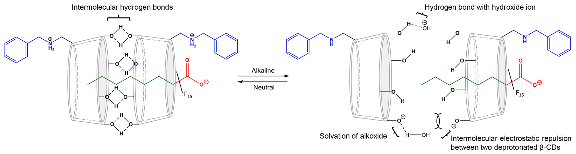 Abstract: Poly- and perfluoroalkyl substances (PFAS) are organic pollutants whose widespread use, resistance to degradation, and adverse health effects have raised significant environmental and public health concerns. The ability of β-cyclodextrin (β-CD) to form strong inclusion complexes with PFAS has led to its incorporation in adsorbents for treating PFAS-contaminated water. Regenerating these PFAS-laden materials often remains challenging. We report herein the functionalization of β-CD with ionizable groups to control host-guest complexation with PFAS in response to pH changes. Adjusting the solution pH from neutral to alkaline led to a 56 to 98 % reduction in the binding constants (KCD:PFAS) of short- and long-chain PFAS with amino- and thiol-functionalized β-CDs. The observed reduction in binding constants under alkaline conditions is attributed to enhanced electrostatic repulsion between negatively charged functional groups attached to β-CD (host) and the anionic PFAS polar head group (guest). Incorporation of two pH-dependent ionizable functional groups, phenol and benzylamino, into β-CD to yield 6-(3-hydroxybenzylamino)-6-deoxy-β-cyclodextrin [(3-OH)BnNHβ-CD] enables the β-CD host to transition from a positive to a negative charge as the solution pH increases from neutral to alkaline. Consequently, (3-OH)BnNHβ-CD exhibits a pronounced pH-modulated complexation of PFOA, with an 88 % decrease in the association constant under alkaline conditions. The association constant for (3-OH)BnNHβ-CD with hexafluoropropylene oxide dimer acid (HFPO-DA), a branched perfluoroether carboxylic acid (PFECA), however, decreases by nearly 50 % under alkaline conditions compared to an 81 % and 98 % decrease observed for mono-thiol and mono-amino β-CDs, respectively. A 95 % decrease in binding in PFOA is observed for mono-thiol-β-CD, while heptakis-(6-mercapto-6-deoxy)-β-cyclodextrin, with seven ionizable thiol groups, leads to a modest 23 % decrease for complexation of PFOA with change from neutral to alkaline pH. Steric effects due to chain branching within PFAS in combination with size and number of substituents on the β-CD reduce the impact of pH effects on the complexation. This study demonstrates derivatization of β-CD with pH ionizable functional groups can be used to control the β-CD binding of PFAS as a possible strategy for the removal and recovery of PFAS from contaminated water streams.