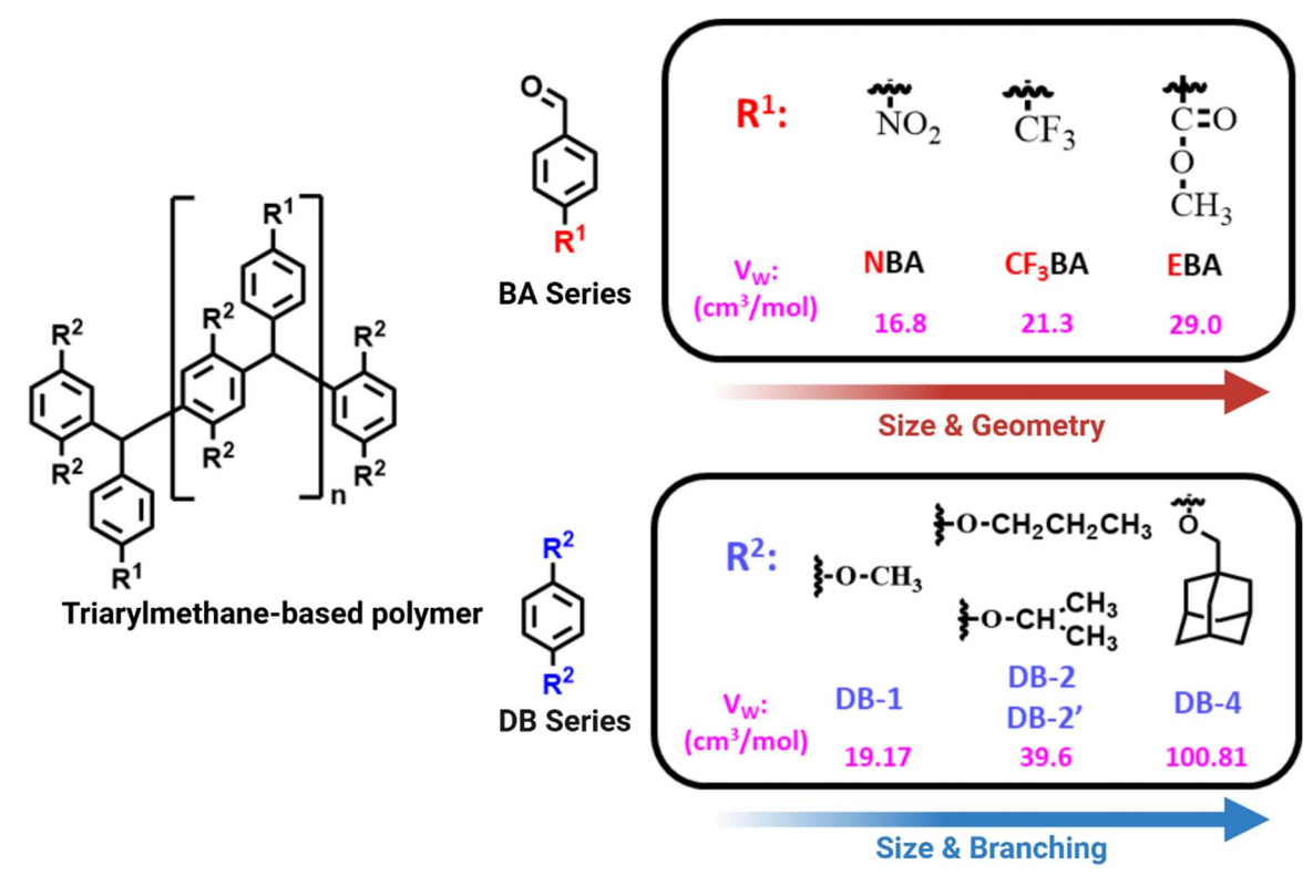 Abstract: Polymer materials are an integral component of our modern world due to their low cost, ease of processability, and tailorable physical and chemical properties, which make them suited to a multitude of applications, including membrane-based gas separations and protective, antifouling coatings for biological sensors. This dissertation addresses both applications through the development of novel Friedel-Crafts polymer membranes and synthesis of surface-initiated polymer brushes within nanoporous biosensors. Following an overview of polymerization methods, recent advances, and state of development in both applications, presented in Chapter 1, the first two chapters of this dissertation utilize the Friedel-Crafts (F-C) polycondensation to produce polymers with systematically varied substitutions and sequences for structure-property investigations into polymer design and gas separation performance. In Chapter 2, two series of triarylmethane-based F-C polymers were synthesized, wherein the size and geometry of R1 or R2 substituent was varied to identify how the key structural components affected gas transport. Increases in substituent size, the degree of substituent branching, or introducing fused rings to the R2 substituent resulted in decreased film densities and increased gas permeabilities, with branched and cyclic substituents seeing increased sizesieving. In Chapter 3, the segmental sequence of F-C copolymers was varied through the synthesis of homo, random, and multiblock polymers and copolymers. Extensive investigation of the copolymers’ gas transport properties revealed that modulating both the ratio of the constituent block lengths and the number of blocks impacted gas permeability through changes in copolymer packing and the creation of subdomains. Transitioning from gas separation membranes, Chapter 4 analyzes the growth of polymer brushes throughout nanoporous gold electrodes through electrochemical and spectroscopic methods. Optimal polymerization conditions were identified for the synthesis of a dense and robust brush throughout the hierarchical pore volume. From the insights gathered in Chapter 4, Chapter 5 explores the polymer-coated nanoporous electrodes sensing capabilities and resistance to biological fouling. Thinner brushes polymerized for short to moderate timeframes exhibited signal gains comparable to the bare electrode through clinically relevant concentrations and without impacting analyte diffusion. Finally, Chapter 6 includes concluding remarks and details the future experiments underway.