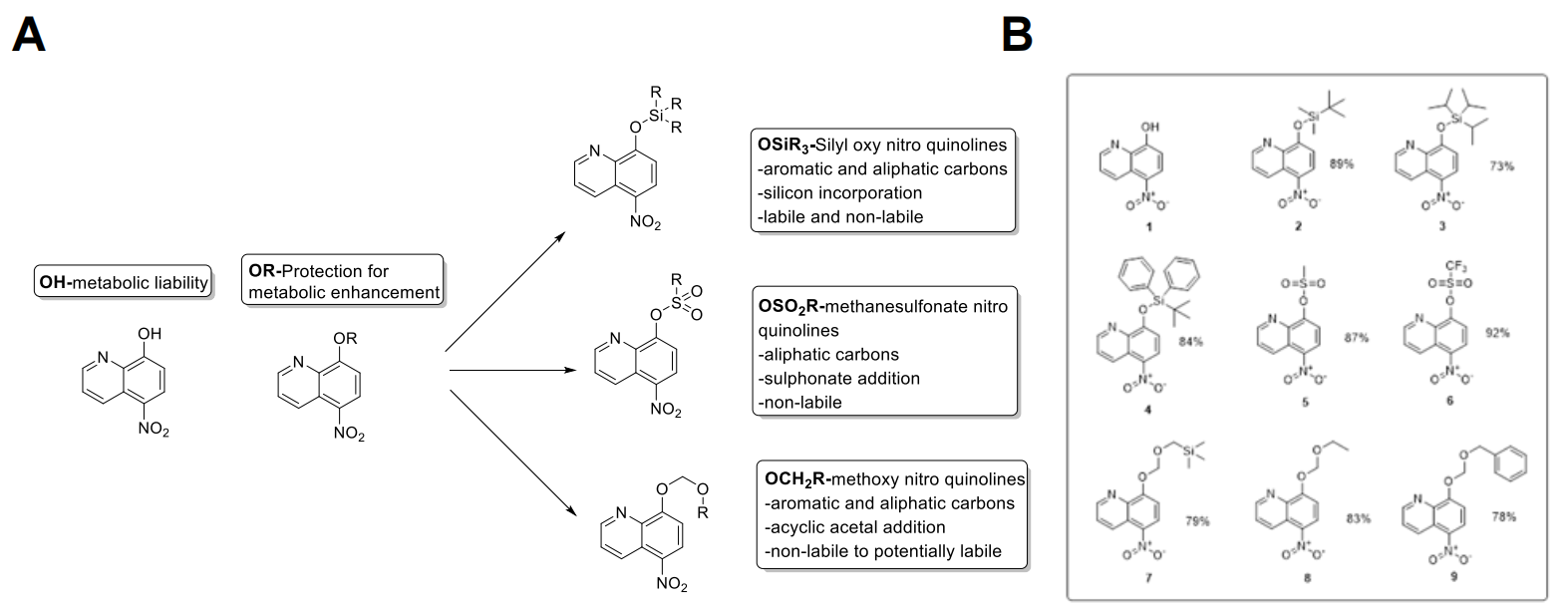 Abstract: Reprogrammed cancer cell proliferation requires high levels of protein synthesis and concomitant folding and processing. N-terminal methionine amino peptidases (MetAP) are a class of enzymes that cleave the initiator methionine amino acids to allow for peptide maturation and co-translational processing. Specifically, based on its role in protein synthesis, MetAP2 has been found to be upregulated in cancer cells and has been explored as a potential anticancer target. Cellular perturbations that impinge on protein synthesis activate cellular stress pathways, including the integrated stress response and mTORC1. Nitroxoline, a MetAP2 inhibitor has been explored as an anticancer agent but is hampered by poor pharmacokinetic properties. Here, we synthesize a few O-substituted silyl and nonsilyl nitroxoline analogs to diversify the nitroxoline template to reduce metabolic vulnerability. In vitro MetAP2 and cancer cell proliferation inhibition assays demonstrate that synthesized analogs retain potency when compared to the parent nitroxoline. Mechanistically, we show that the lead candidate compound 3 and nitroxoline activate ATF4 mediated stress responses through non-canonical mTORC1. These results further implicate MetAP2 protein processing in mTORC1 nutrient sensing pathways and provide novel synthetic analogs of nitroxoline for potential cancer treatment.