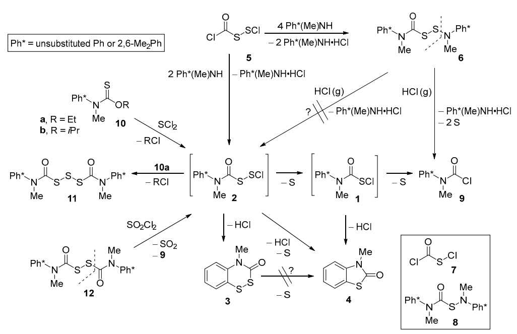 Abstract: Previously unobserved (carbamoyl)disulfanyl chlorides were prepared by (i) addition of limiting aromatic secondary amine to (chlorocarbonyl)disulfanyl chloride; (ii) Harris reactions of sulfur dichloride with appropriate O-alkyl N-methyl-N-arylthiocarbamates; and (iii) regiospecific chlorolysis of bis(N-methyl-N-arylcarbamoyl)disulfanes. The newly synthesized unstable species were observed in situ by 1H NMR and were trapped with alkenes, thiocarbamates, and thiols using methods precedented by the chemistry of analogous (carbamoyl)sulfenyl chlorides. Furthermore, each of the trapped products was synthesized by an alternate route, reinforcing conclusions about their structures. While (N-methyl-N-phenylcarbamoyl)disulfanyl chloride was unstable and decomposed quickly or cyclized intramolecularly, introduction of the N,2,6-trimethylphenyl moiety led to significantly improved stability. As part of this study, an interesting, unexpectedly stable 1,2,4-dithiazinone was discovered and its structure was established by X-ray crystallography. The new heterocycle, with its twisted out-of-plane disulfide bond in a six-membered ring, readily donated a sulfur atom to triphenylphosphine; this reaction resulted in the formation of triphenylphosphine sulfide, along with the corresponding highly stable heterocycle in which the single sulfur that remains is part of a planar five-membered ring, fused to a co-planar aryl moiety.