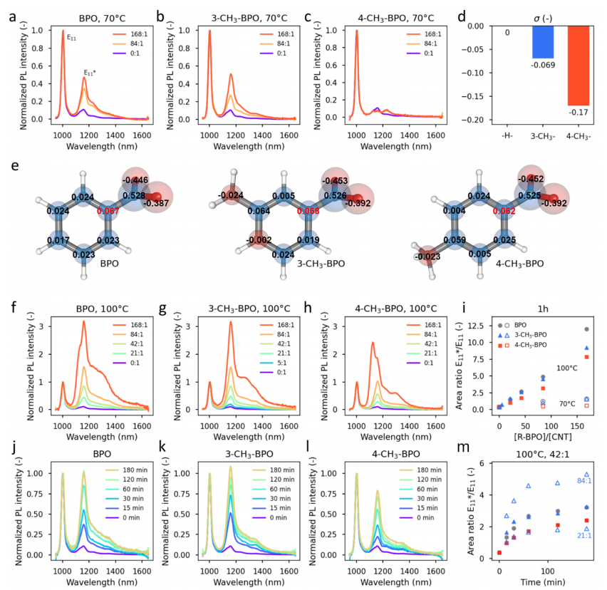Abstract: Semiconducting single-walled carbon nanotubes (SWCNTs) have great potential for optoelectronics and photonics, further enhanced by covalent functionalization. However, scalable and controlled surface modification is challenging due to complex methodologies and unstable reagents. Benzoyl peroxide (BPO) has emerged as a simple alternative for introducing luminescent defects into SWCNTs. Yet, the lack of understanding of its radical chemistry limits precise defect engineering using BPOs. This is a major obstacle to the effective application of BPO in chemistry, despite its widespread use as a radical initiator. We present a thorough investigation into the radical chemistry of self-synthesized BPOs for functionalizing polymer-wrapped (6,5) and (7,5) SWCNTs in non-polar solvents, providing critical insights into the decomposition of BPO and its analogs. By varying the electronic and steric properties of typically unavailable BPO derivatives, we demonstrate tunability over the photoluminescence characteristics of SWCNTs, allowing control over defect density and light emission wavelength. This toolbox of BPO derivatives, created with simple radical chemistry and accessible organic precursors, alongside clarified structure-property relationships, facilitates effective implementation of BPO in chemical transformations and meticulous engineering of luminescent defects in SWCNTs for optoelectronic applications. Notably, this research offers insights into why SWCNTs modified with electron-deficient reactants provide the best optical characteristics.
