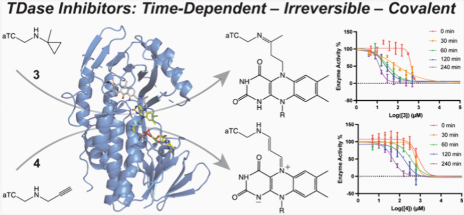 Abstract: Next-generation tetracycline antibiotics are threatened by an emerging resistance mechanism ─ enzymatic inactivation. The relevant enzymes ─ tetracycline destructases (TDases) ─ are structural homologues of class A flavin monooxygenase (FMO) that oxidize tetracycline antibiotics, leading to various inactive degradation products. Small molecule inhibitors of antibiotic-inactivating enzymes are critical clinical therapeutics used to manage bacterial resistance with combination therapy. While reversible TDase inhibitors have been reported, we sought to develop covalent inhibitors that are better aligned with clinically effective covalent β-lactamase inhibitors. Here, we report the design, chemical synthesis, and biochemical characterization of the first covalent irreversible inhibitors of TDases based on C9-derivatives of anhydrotetracycline (aTC). The reactive warheads were installed via a one-step Mannich reaction linking either an N-(1-methyl)cyclopropylamine or N-propargylamine group to the C9-position of the aTC D-ring via an amino methylene linkage. We also synthesized two nonspecific FMO inhibitors, N-(1-methyl)cyclopropylbenzylamine (1) and N-methyl-N-benzyl-propargylamine (2) as mechanistic probes to distinguish reactivity with the essential FAD cofactor in TDases via one- or two-electron transfer pathways, respectively. We evaluated the compounds as potential inhibitors of representative TDases from the two major classes─Type 1 (TetX6 and TetX7) and Type 2 (Tet50). The aTC-based compounds 3-5 inhibited both Type 1 and Type 2 TDases with notable differences in potency and inhibition mechanism. The inhibition of Type 1 TDases was more potent but reversible with no time dependence. The inhibition of Type 2 TDases was time-dependent and irreversible even after exhaustive dialysis, consistent with a covalent mechanism of inhibition. Molecular modeling of the inhibitors supports unique inhibitor binding modes for Type 1 and Type 2 TDases that are consistent with the observed differences in the inhibition modes. Blue light irradiation of the Type 2 TDase enhanced this reactivity. Treatment of Tet50 with probe molecules 1 and 2 under blue light exposure enabled the identification of covalent FAD adducts via mass spectrometry that are consistent with the expected one- and two-electron transfer reaction modes of the cyclopropylamine and propargylamine warheads with the FAD cofactor. At concentrations as low as 2 μg/mL, the aTC-based covalent inhibitors 3-5 recovered tetracycline activity against E. coli overexpressing TDases. Our findings suggest that the inhibition of TDases through covalent trapping of the FAD cofactor is a viable strategy for overcoming TDase-mediated antibiotic resistance.